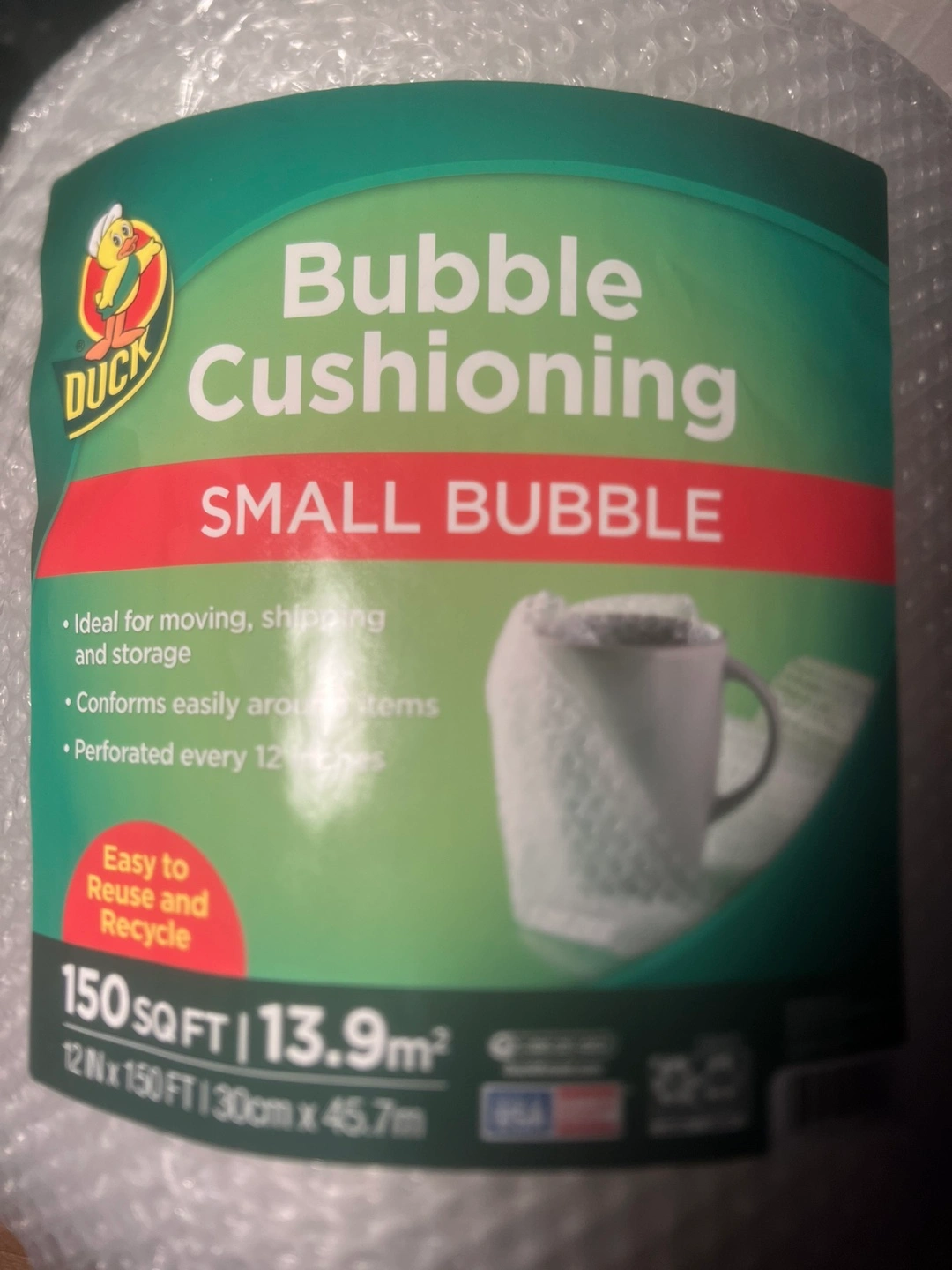 150 sq ft roll of small bubble cushioning wrap. Ideal for moving, shipping, and storage. Conforms easily around items. Perforated every 12 inches. Easy to reuse and recycle. Did not use, sealed in original packaging