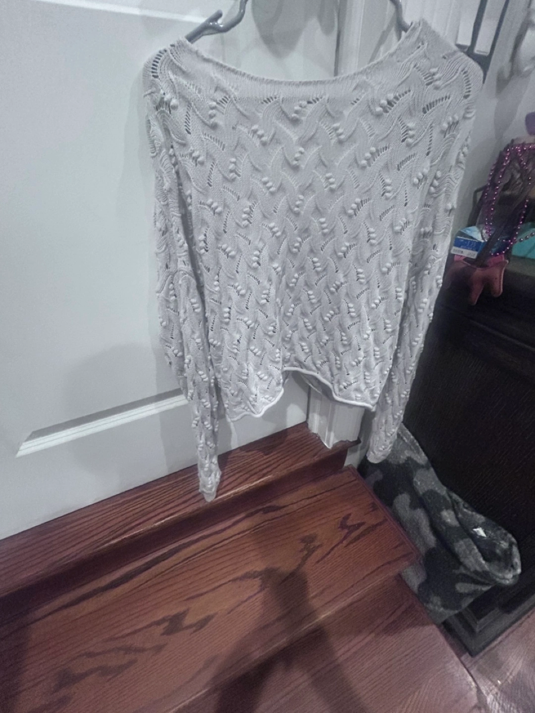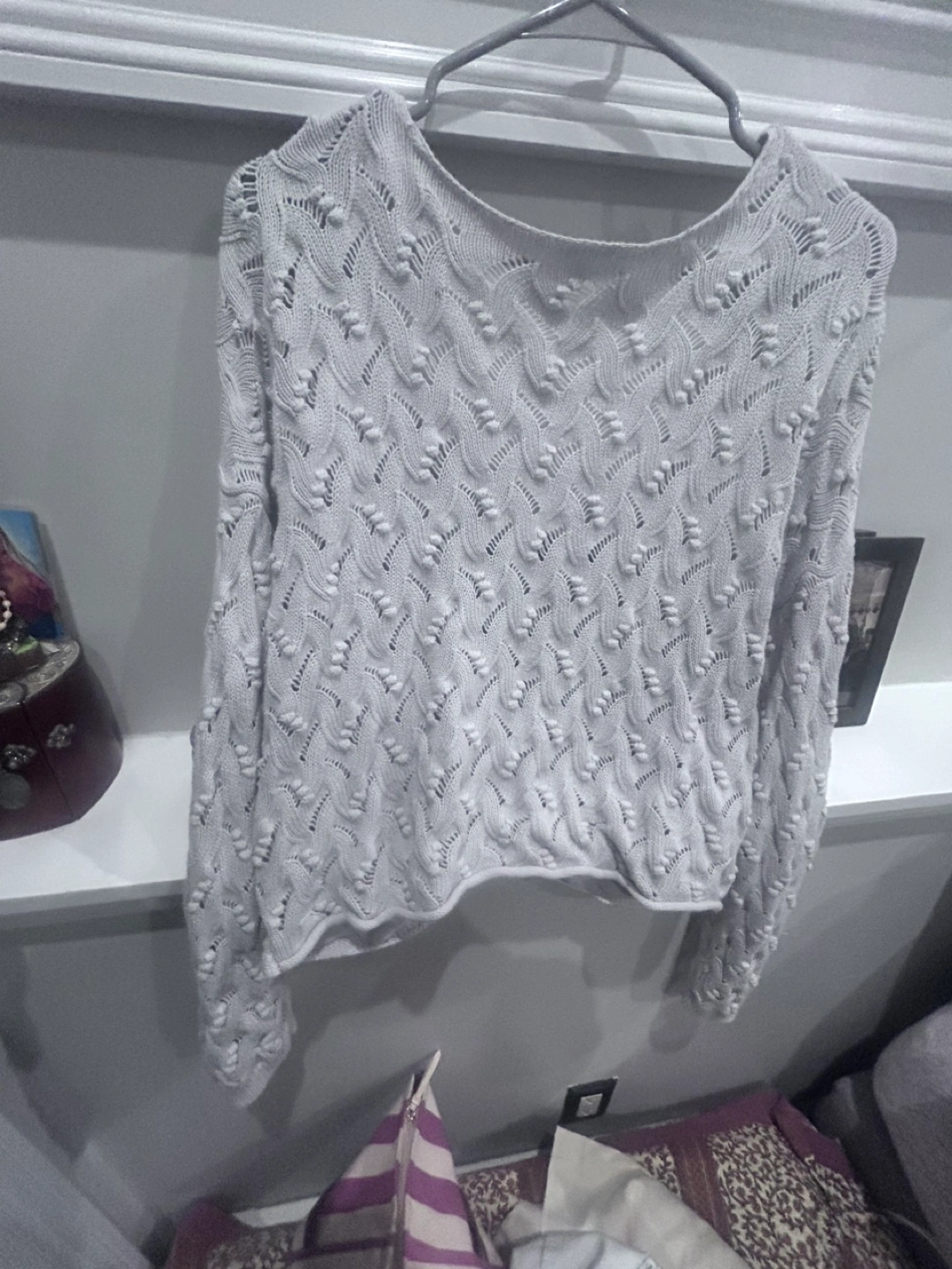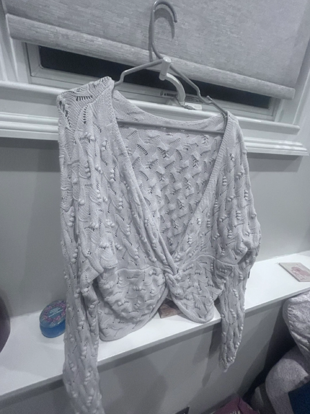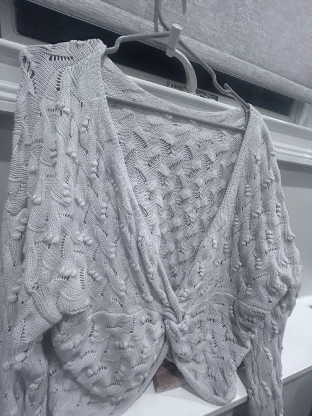 Light Grey, long-sleeved, cropped sweater. Intricate knit pattern. Open back with Twist detail !!Lightweight material.