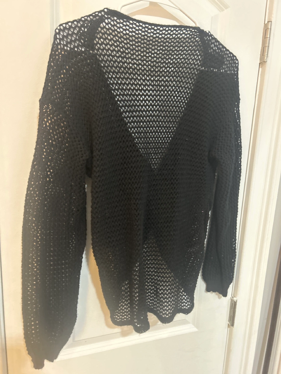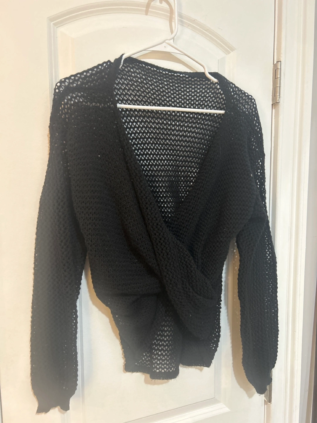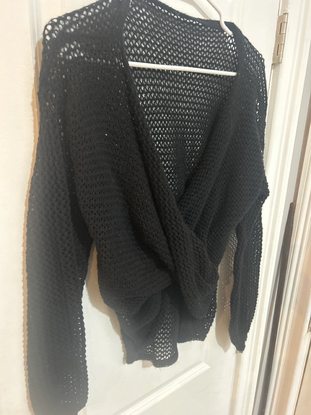 Long sleeve black sweater. Open knit design. Cross-front detail. Lightweight material.