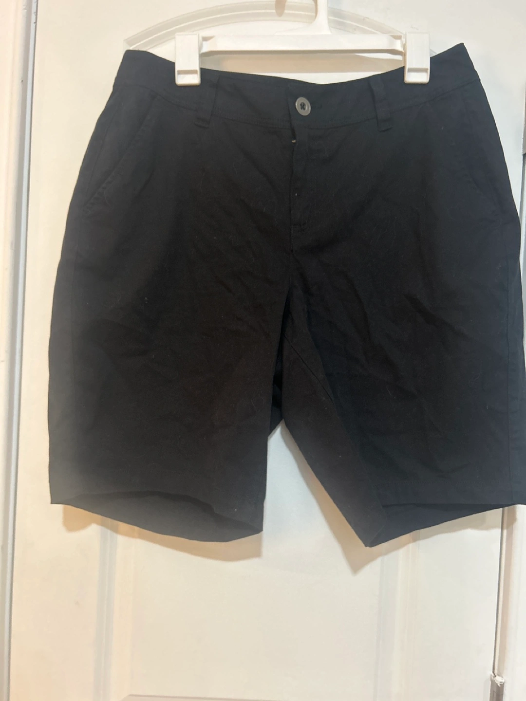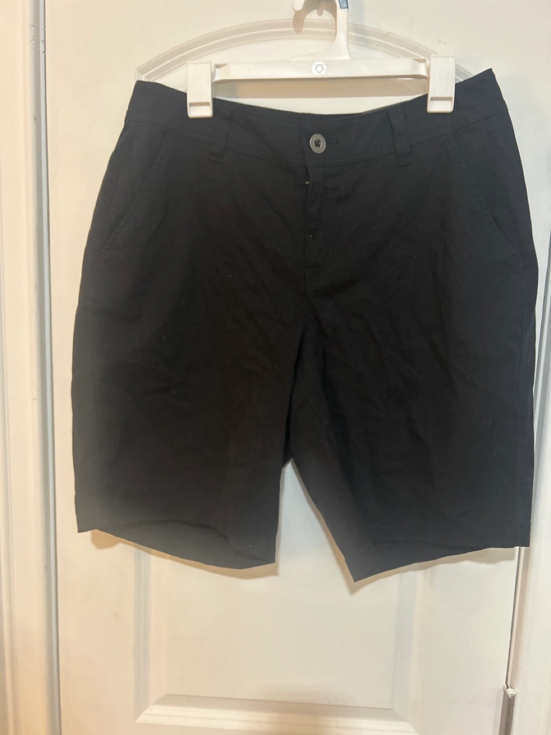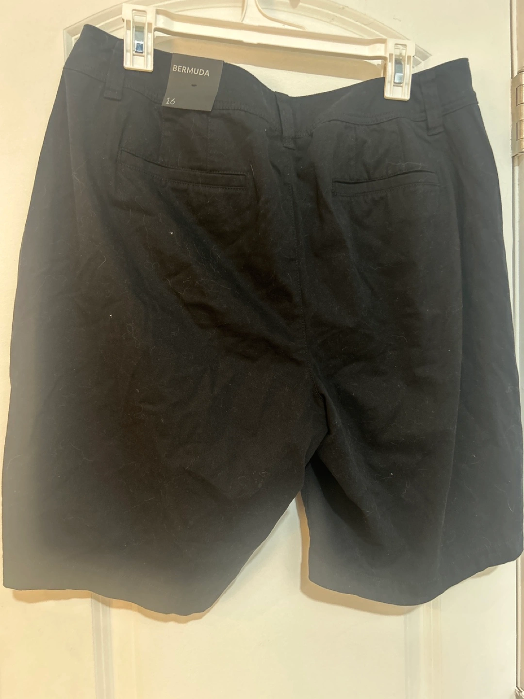 Black Bermuda shorts. Size 16. Two front pockets. Button and zipper closure.