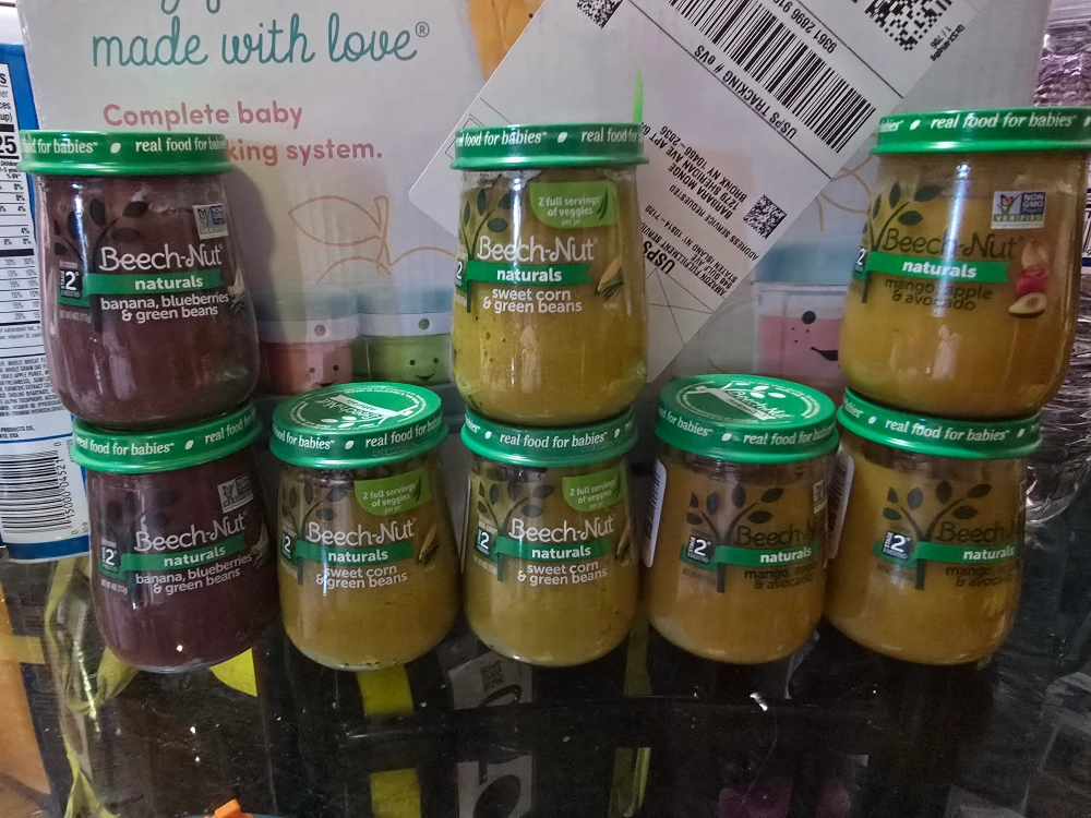 1000+Eight jars of Beech-Nut Naturals baby food. Flavors include banana blueberries and green beans, sweet corn and green beans, and mango apple and avocado.
