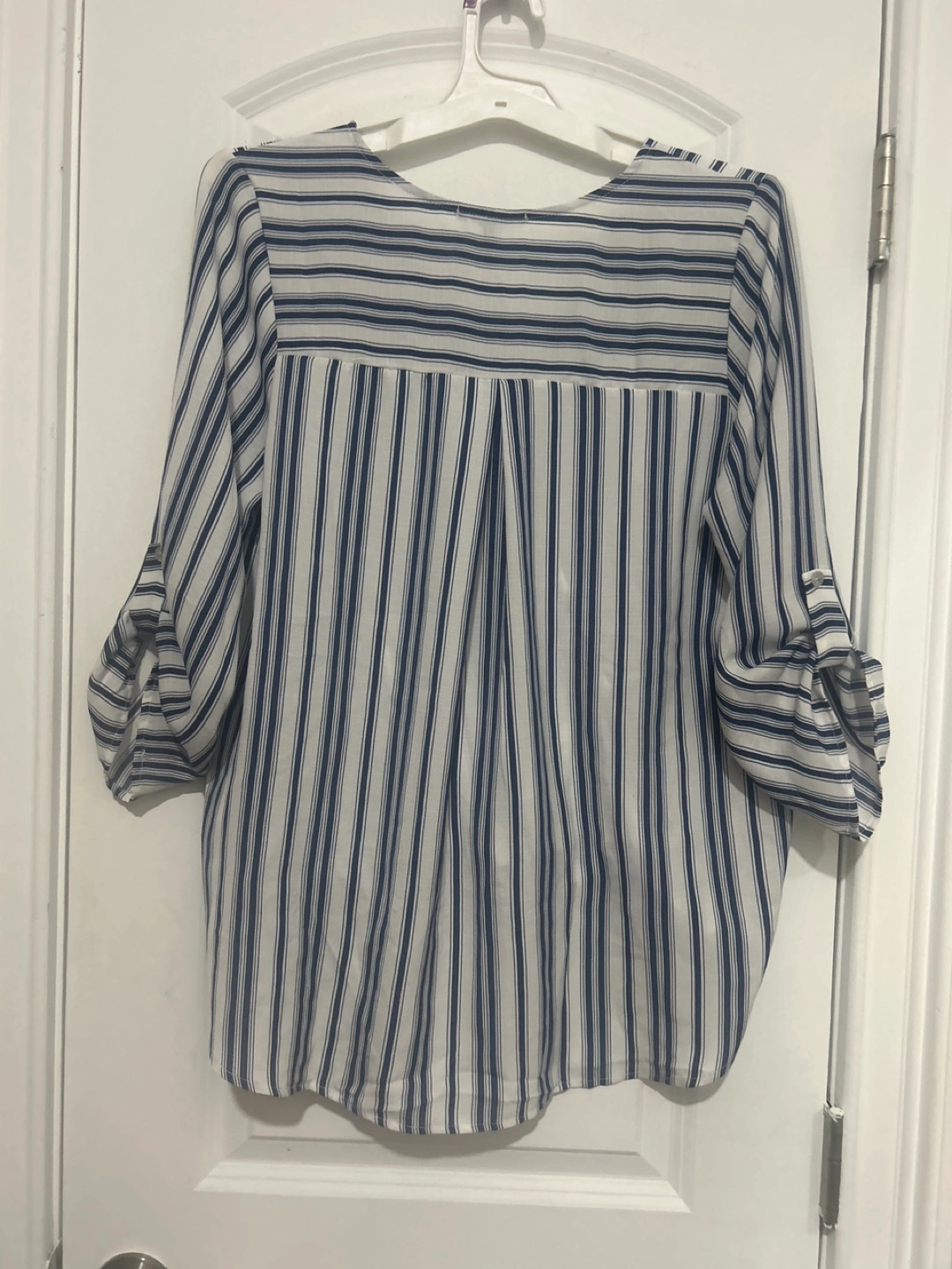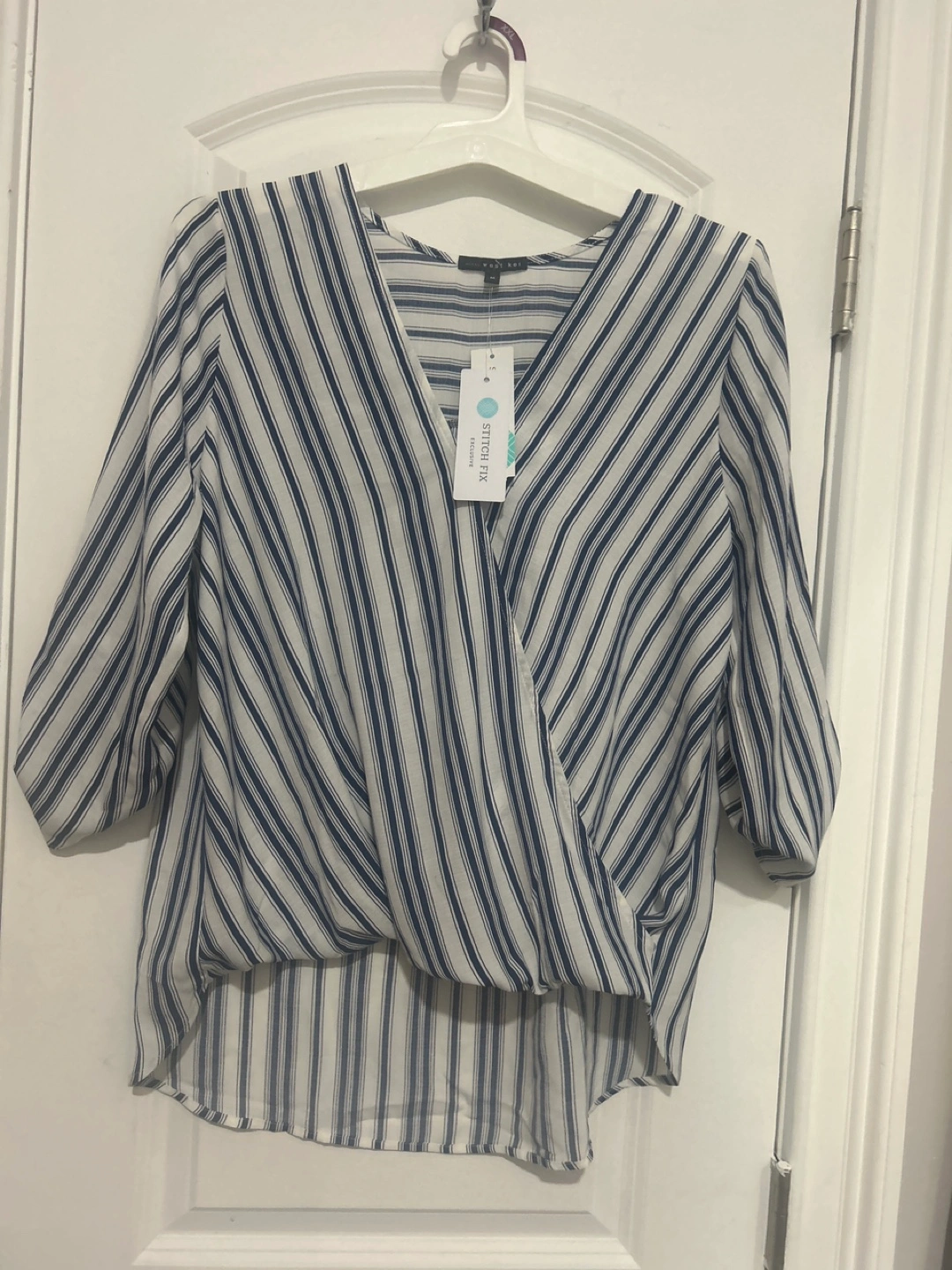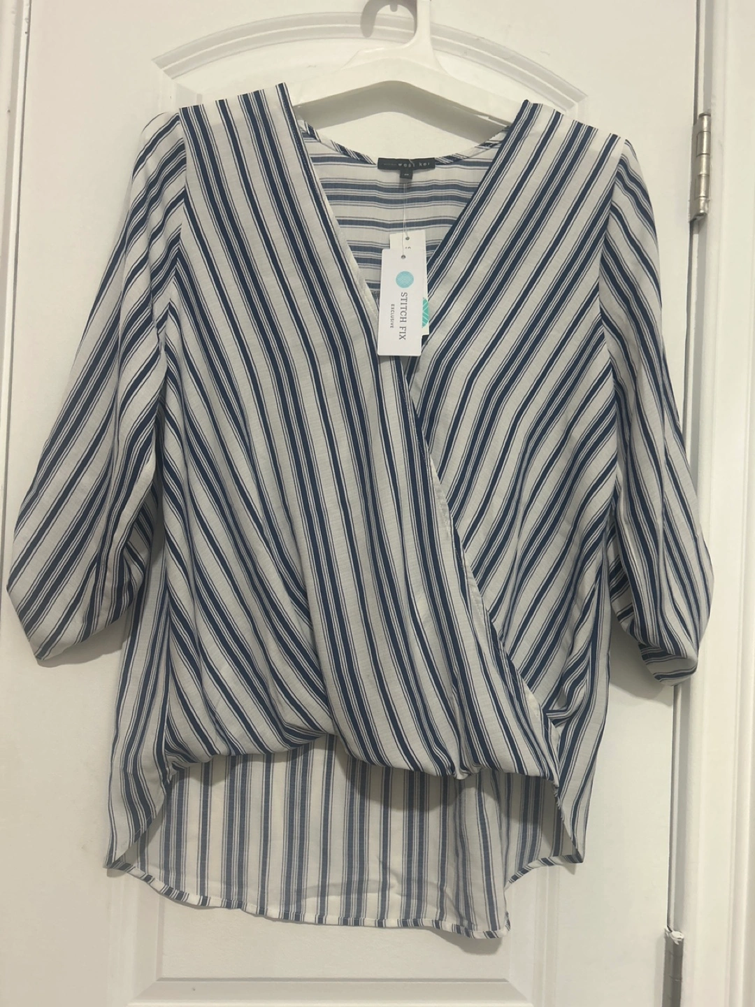 Blue and white striped blouse. Three quarter sleeves. Wrap style. Size M. New with tags.