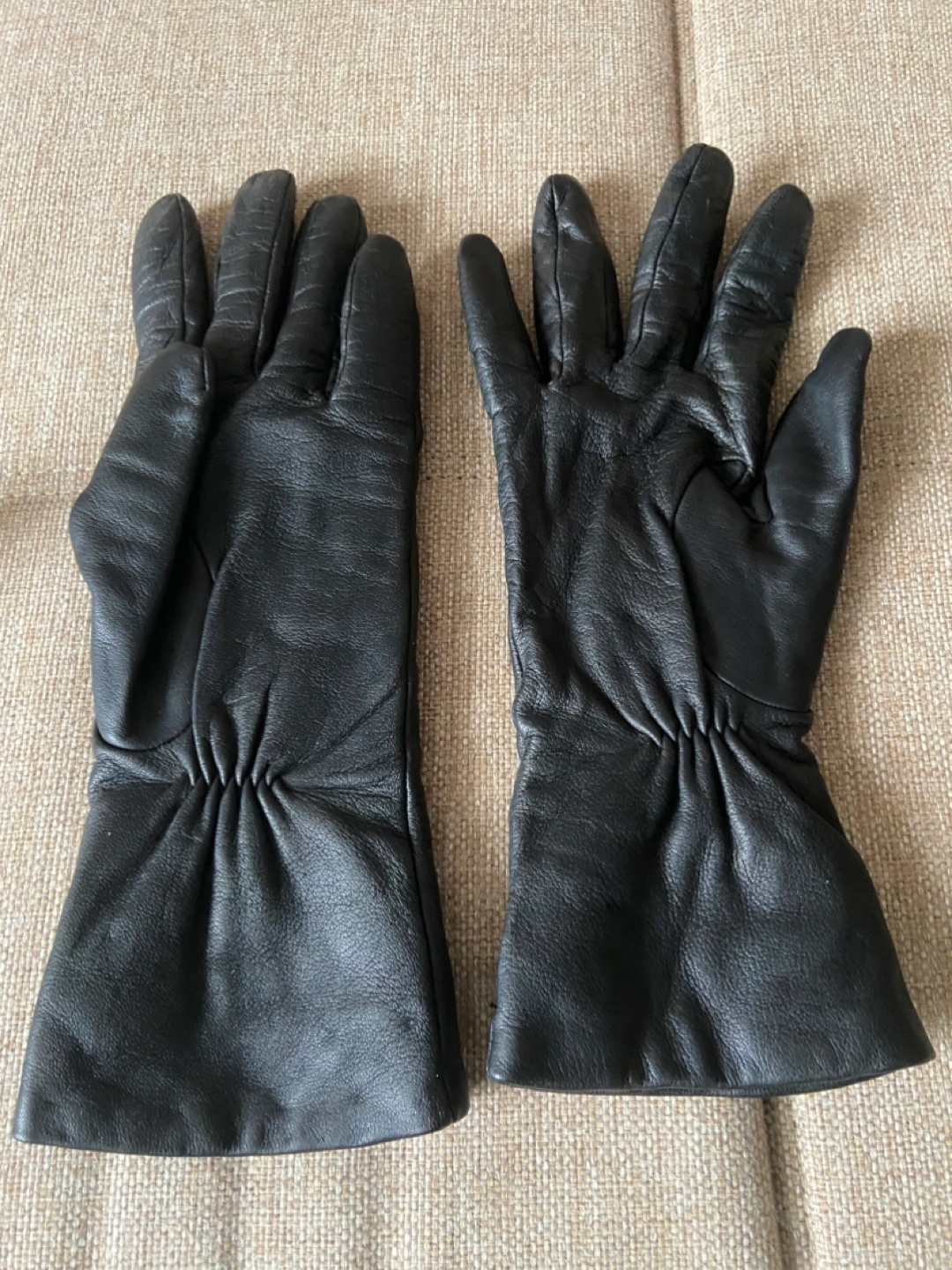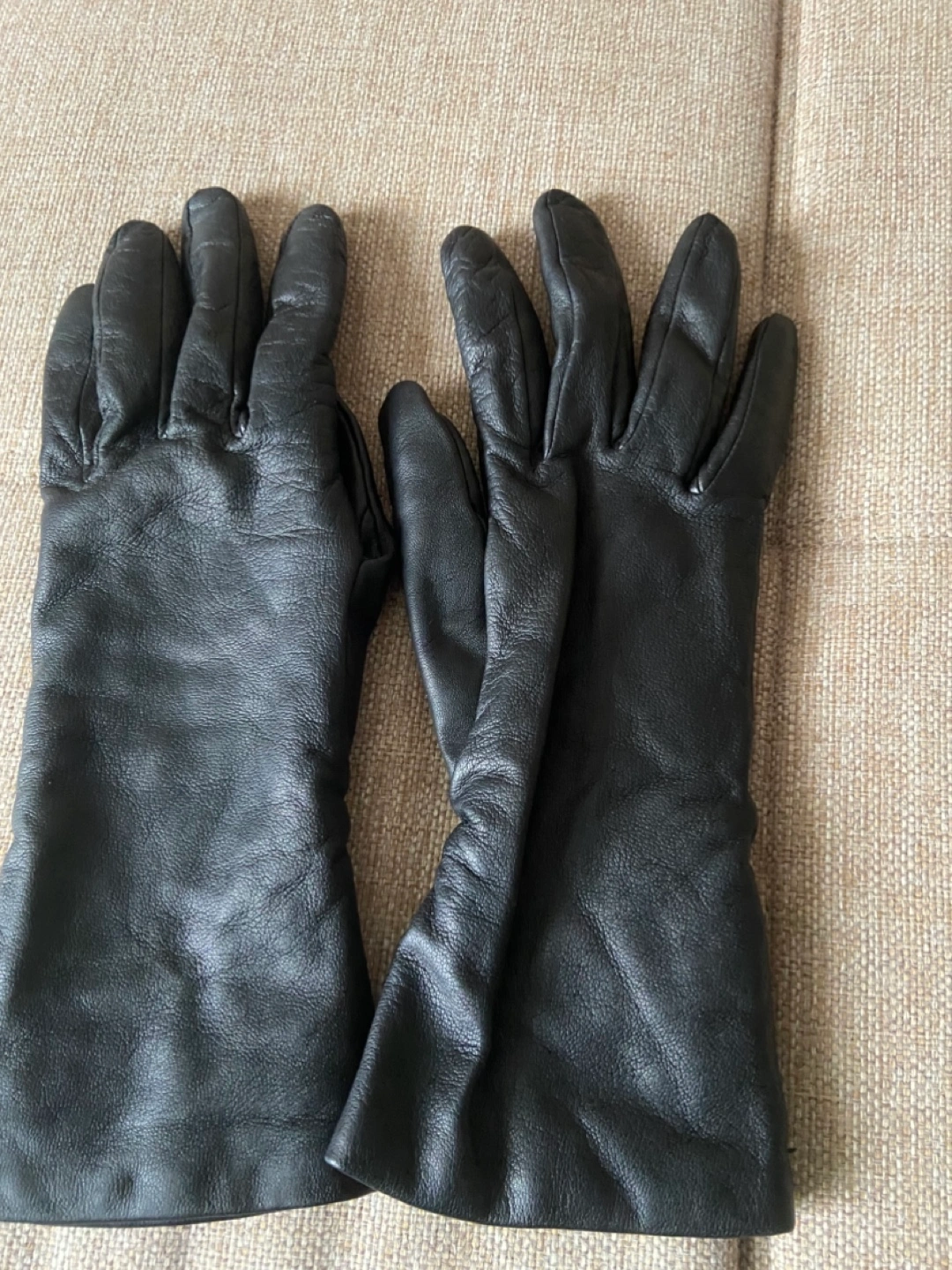 Pair of black leather gloves. Long length. Good condition.Genuine Leather. Made in Italy. 100 % Cashmere Lined. Women Size 8.5
