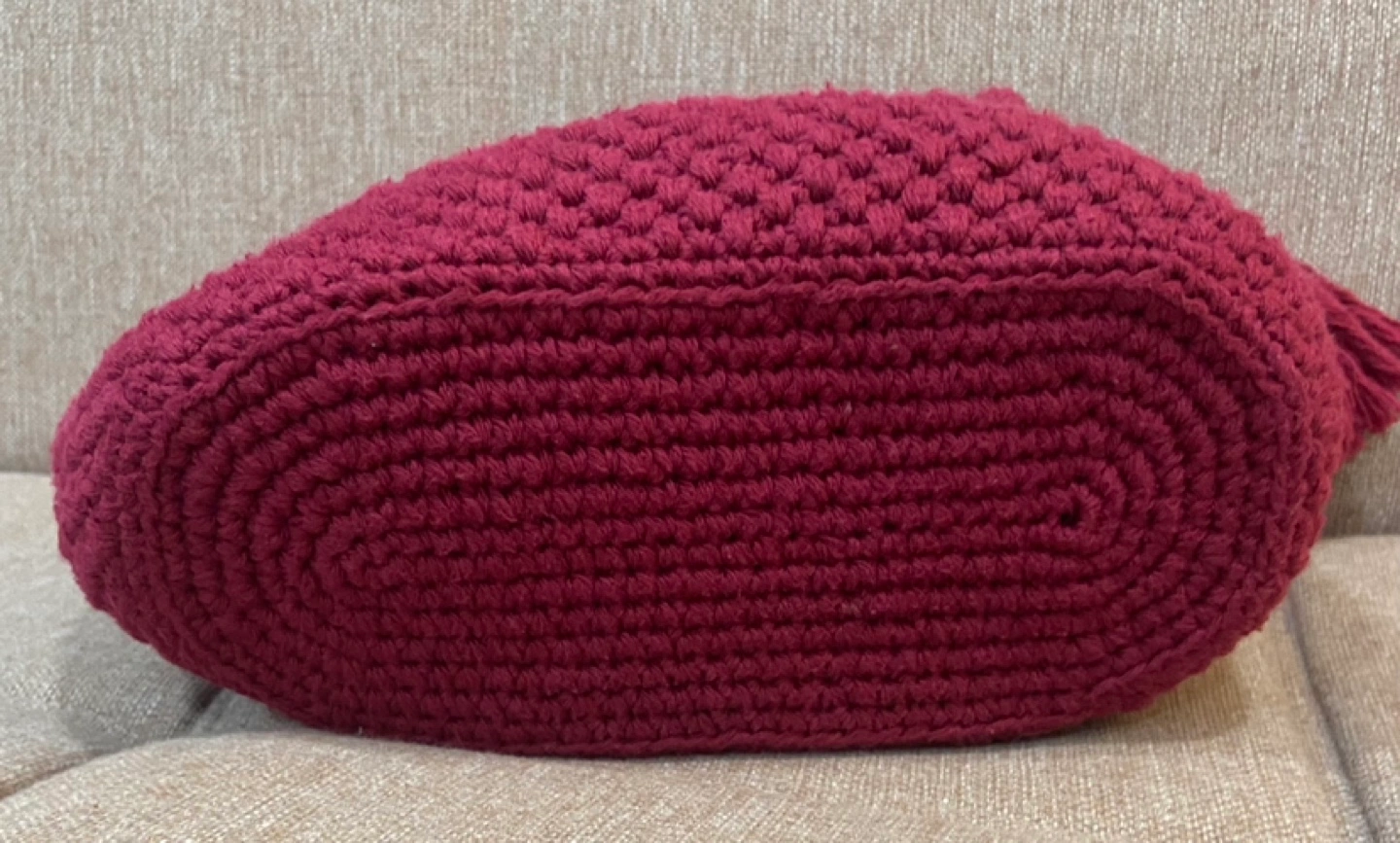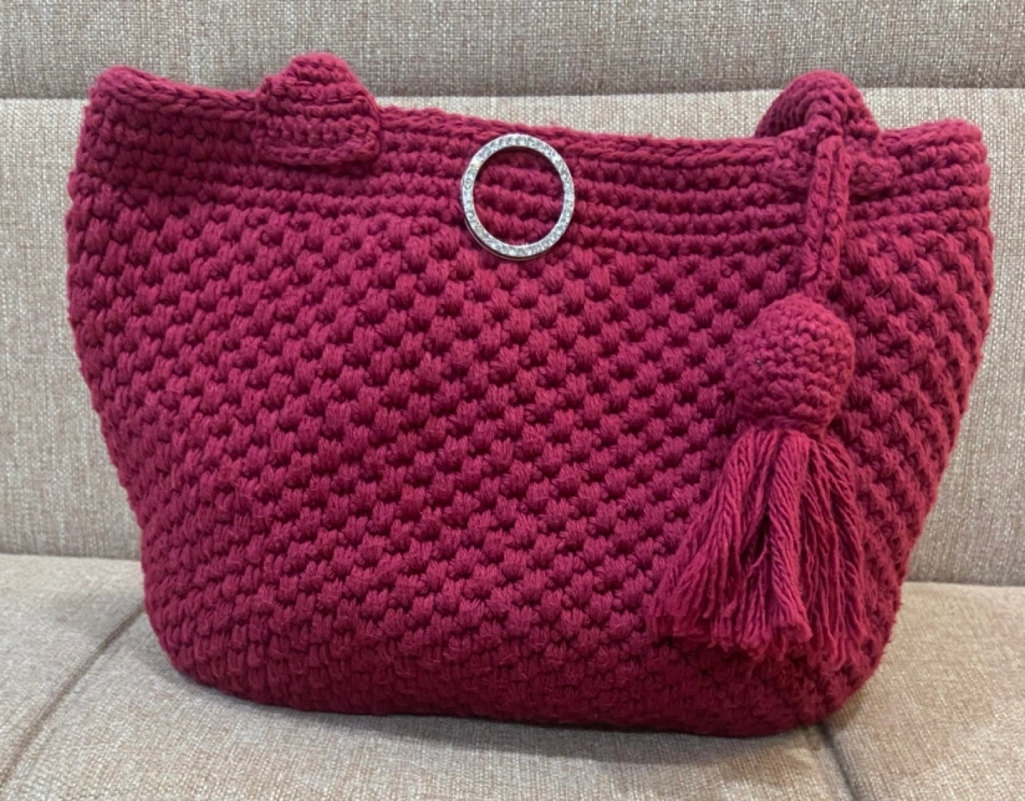 Unique burgundy tote bag. Handmade Crochet.Features a textured design, long handles, and a decorative tassel. Includes a small jeweled accent. Size: Length: 9 inc. Width: 15 inch.