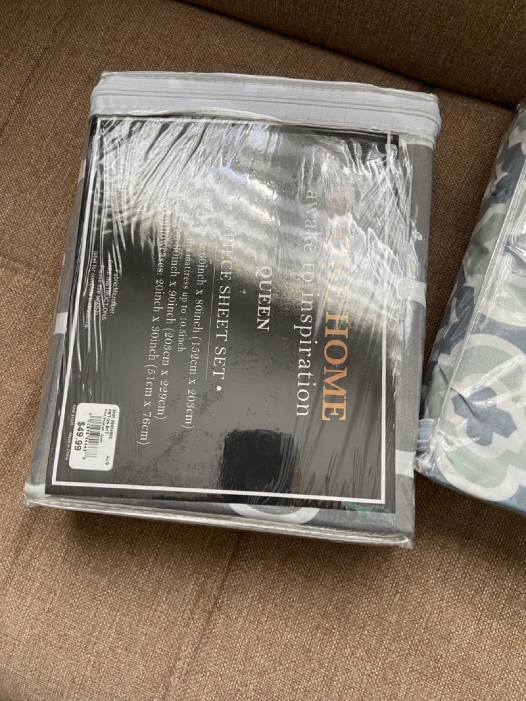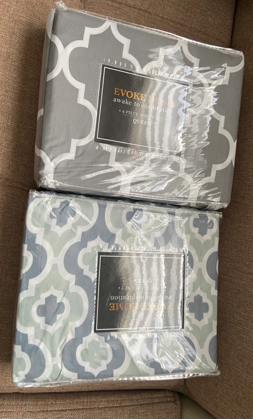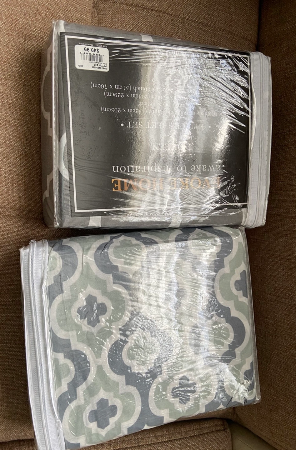brand new queen sheet sets. Gray and green geometric pattern. Still in original packaging.
