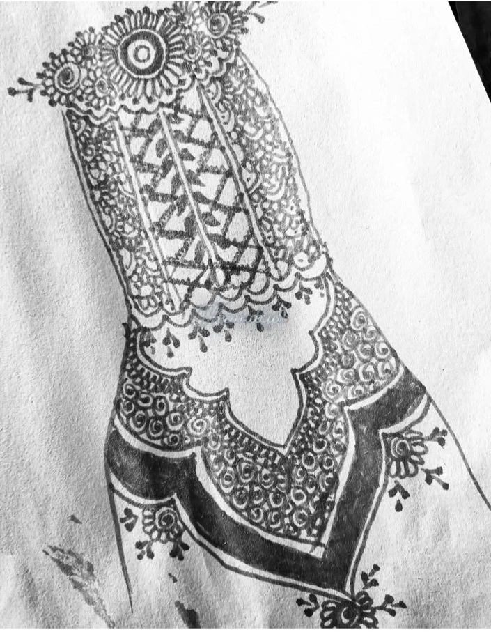 Intricate henna hand design printed on fabric. Great for crafting or textile art projects. Black ink on off-white material. Unique and beautiful pattern.