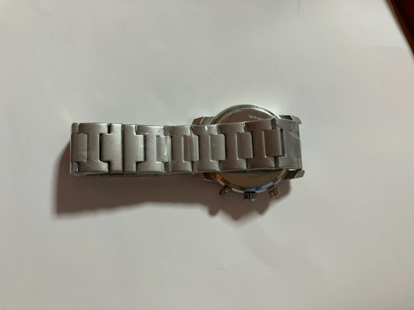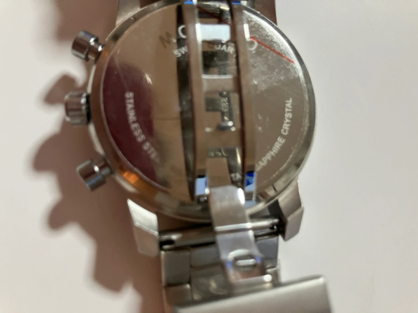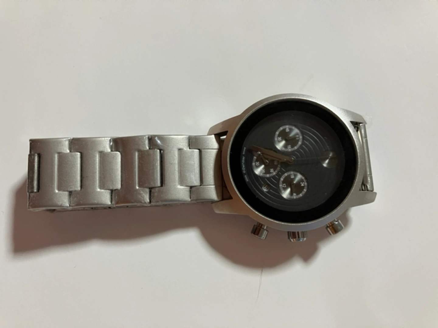 Silver Movado Bolt Chronograph with factory matching bracelet, butterfly clasp, 22mm wide can be easily replace with leather or rubber band. Made in Switzerland with Swiss quartz movement water resistant. Functions time, seconds are in small circle above 6, chronograph 1 second interval, date at 5. The circles on the dial add another dimension. Used in excellent conditions ana running order