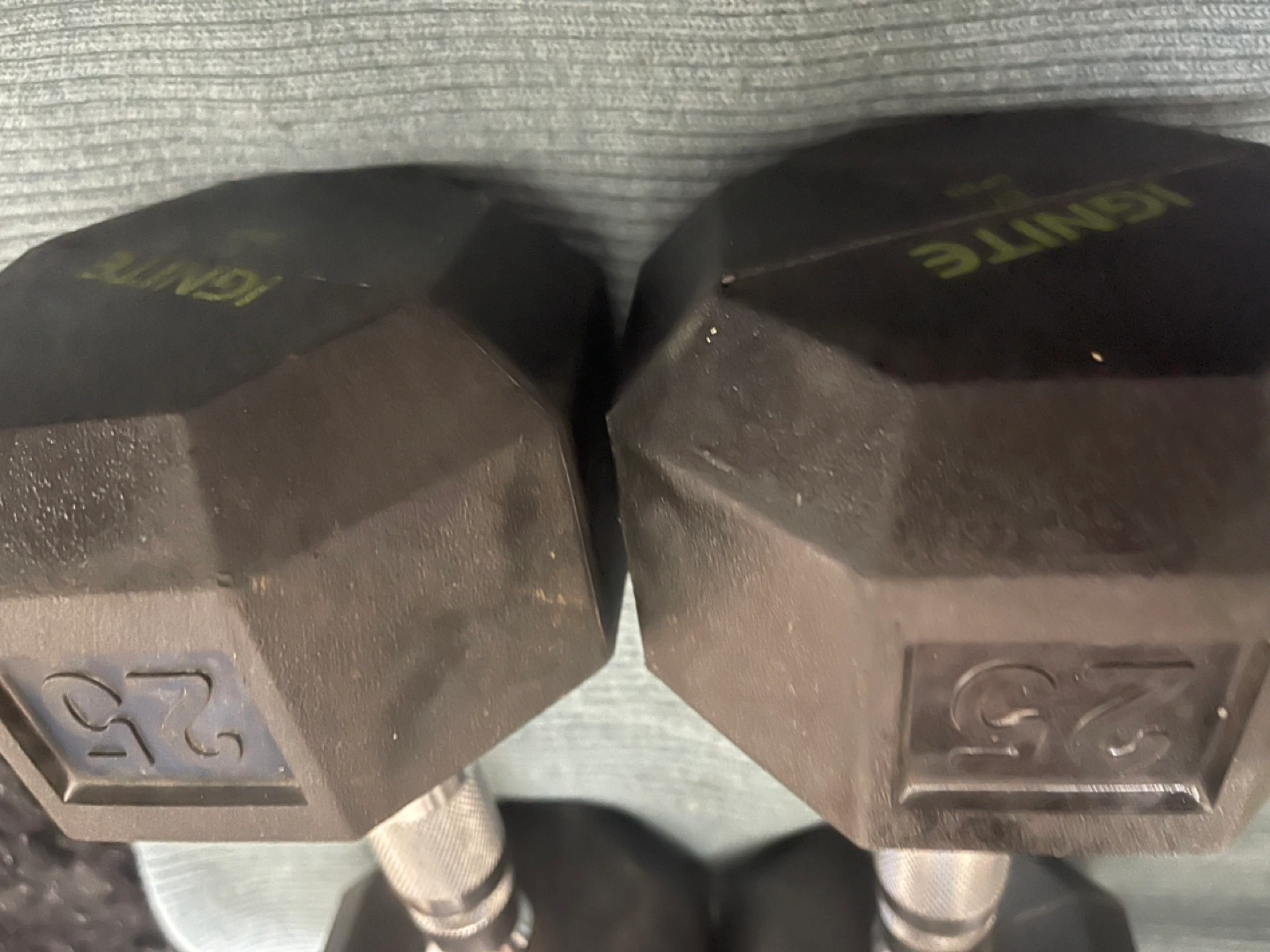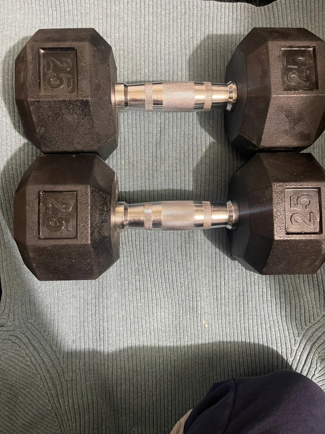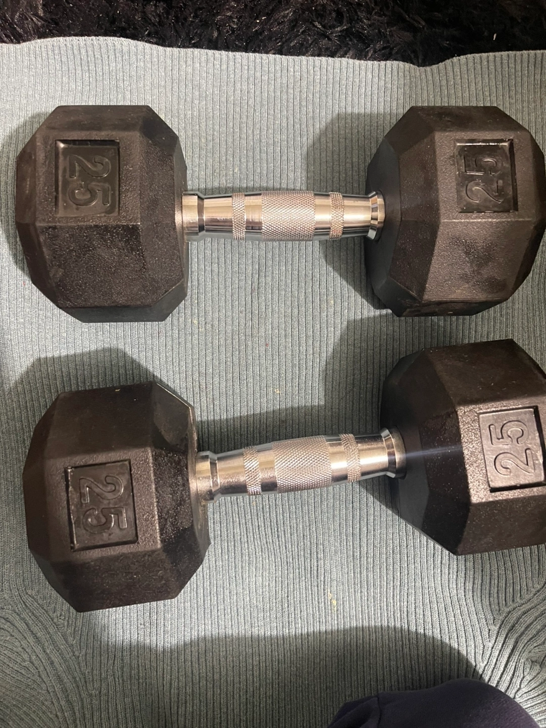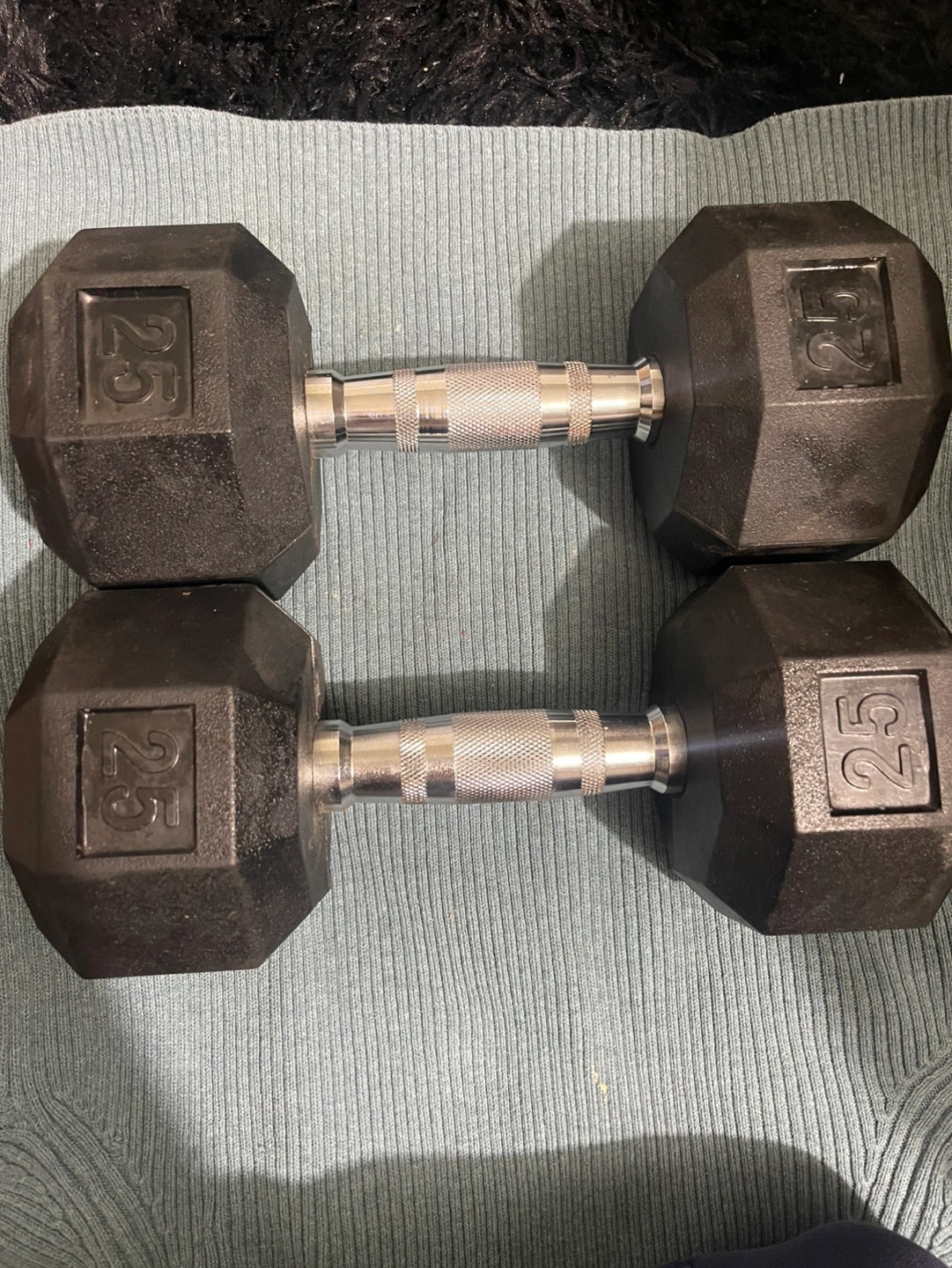 262Two 25-pound hex dumbbells. Chrome handles. Excellent for home gym workouts. Sold as a pair.