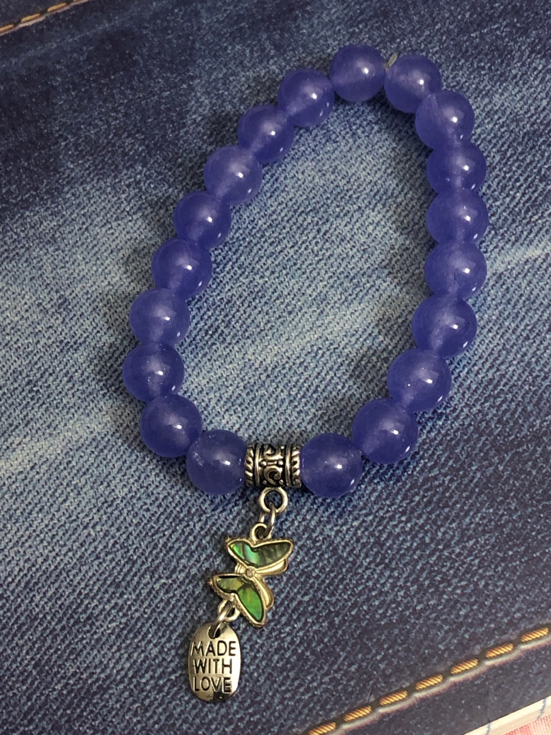 Beautiful purple beaded bracelet. Features a cute butterfly charm with 'Made with Love' inscription. Perfect accessory for everyday wear.Handmade