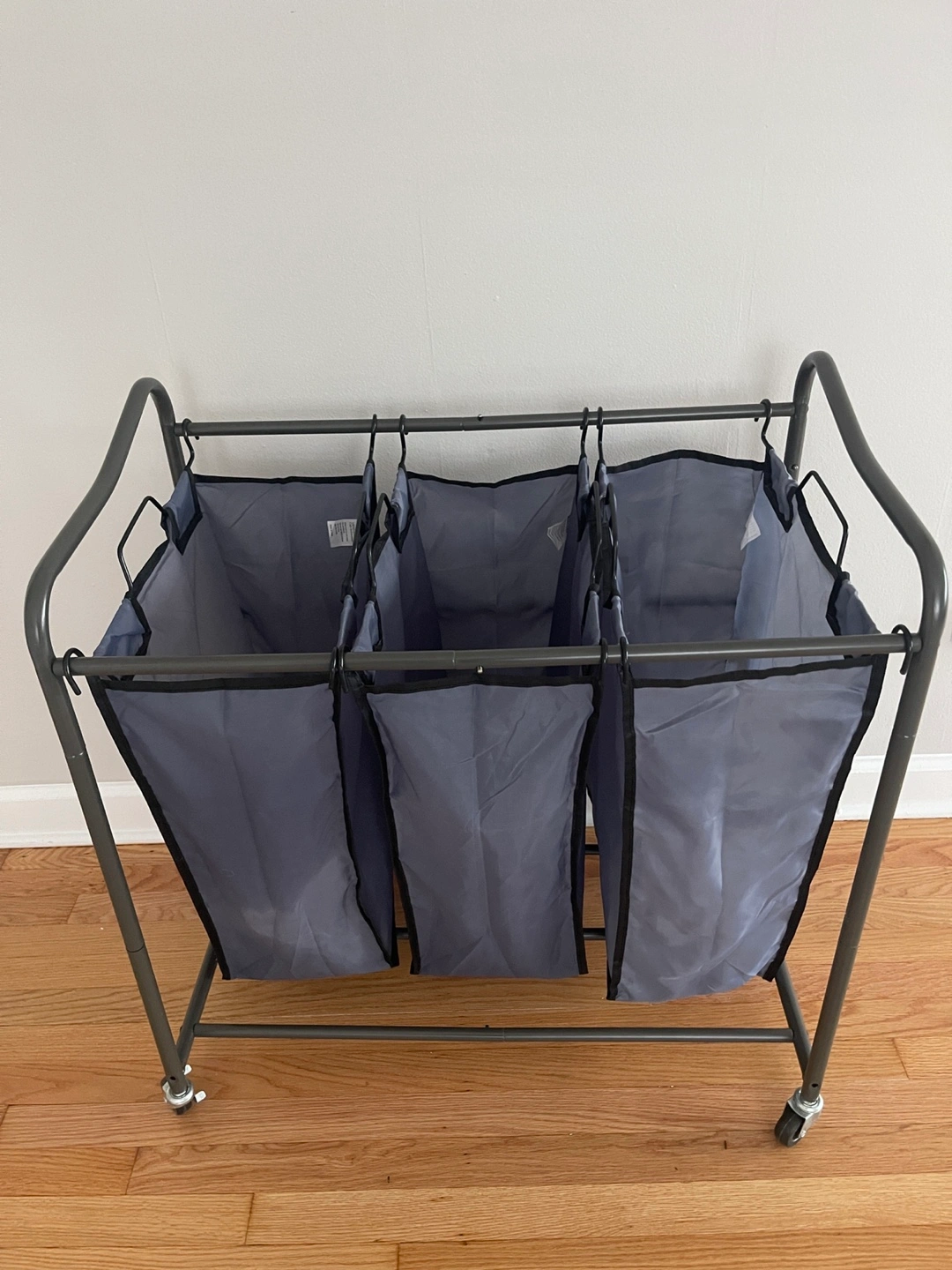 Grey rolling laundry cart. Three removable fabric bags. Metal frame. Wheels for easy mobility. Great for organizing laundry.