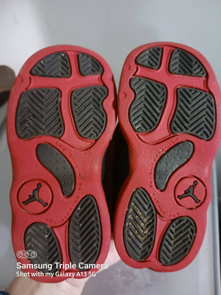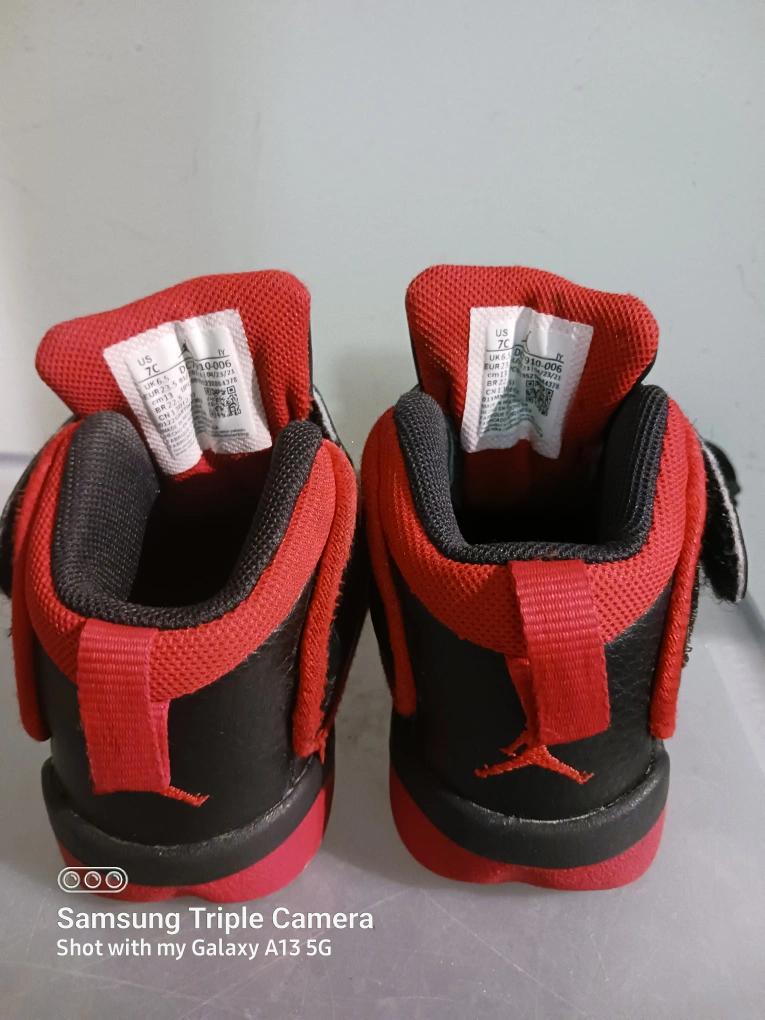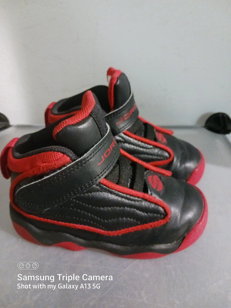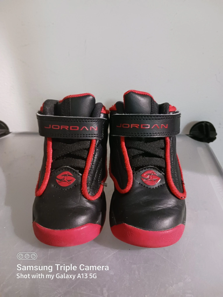 252Infant Jordan Brand shoes. Black and red. Size 4C. Velcro straps. Used condition.