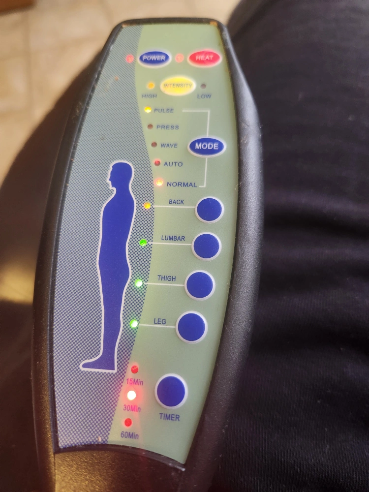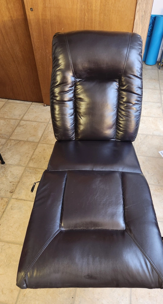95Large, relaxing, armless reclining chair. Vibration & heat settings available from upper back to legs. Fully functional as shown in photo of the remote. Dark brown imitation leather. Good condition, minor wear. Footrest extends. Swivel base.