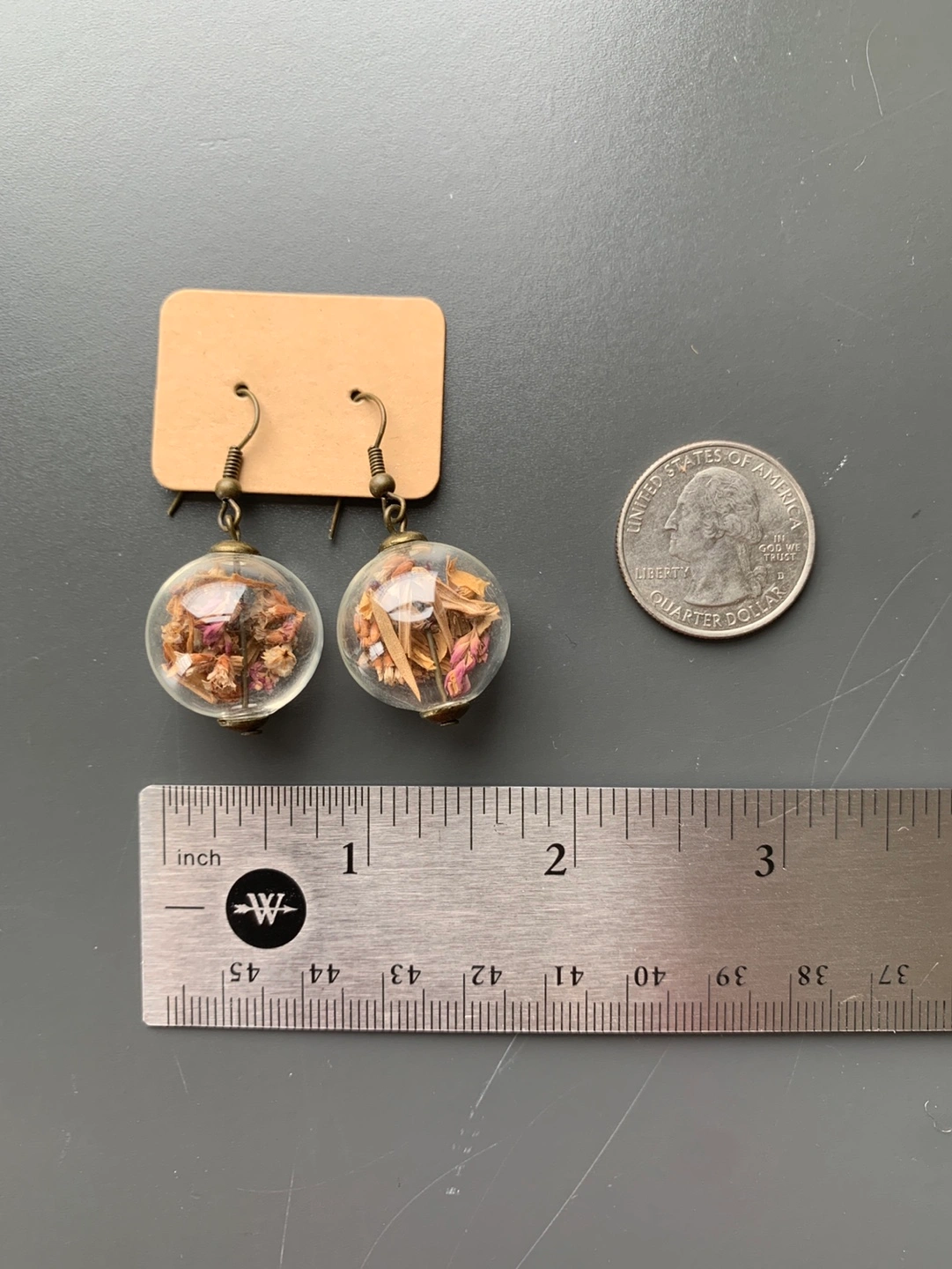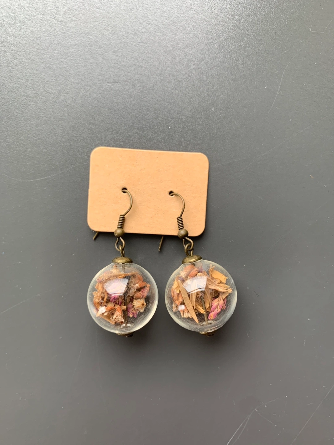 395Unique handmade earrings. Features dried flowers encased in clear glass balls. Bronze-tone hooks. Approximately 3/4 inch in diameter.