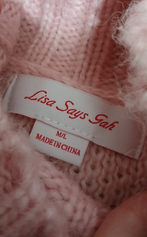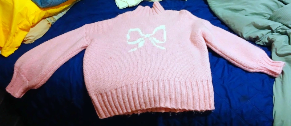1000+Adorable pink knit sweater. Features a white knit bow detail on the front. Mock neck. Medium/Large/XLarge. Soft and cozy. Made in China. I'm giving this purchase, because it doesn't fit me