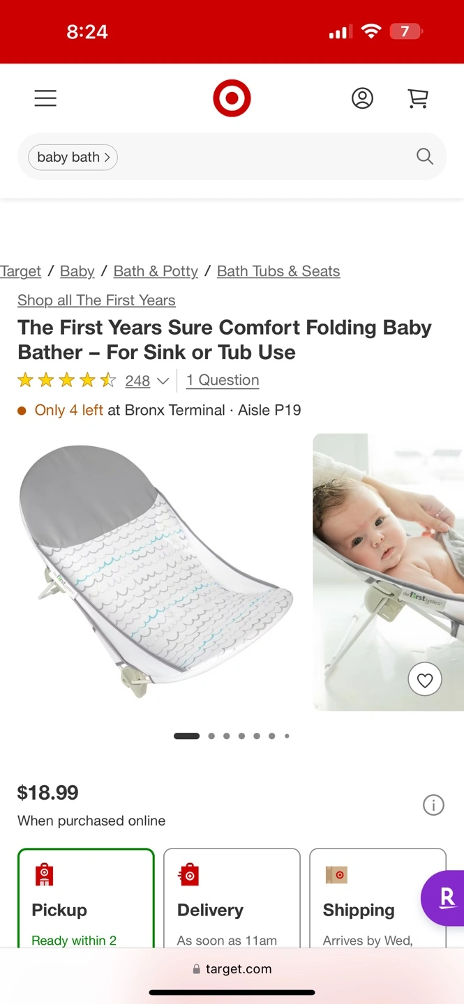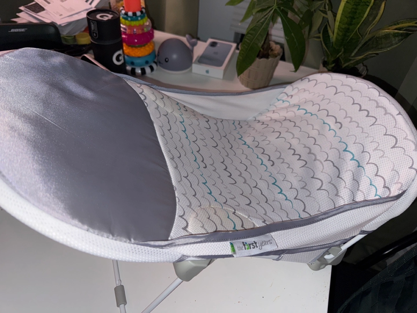 Infant bath seat. Grey and white. Folds for storage. Sink or tub use.