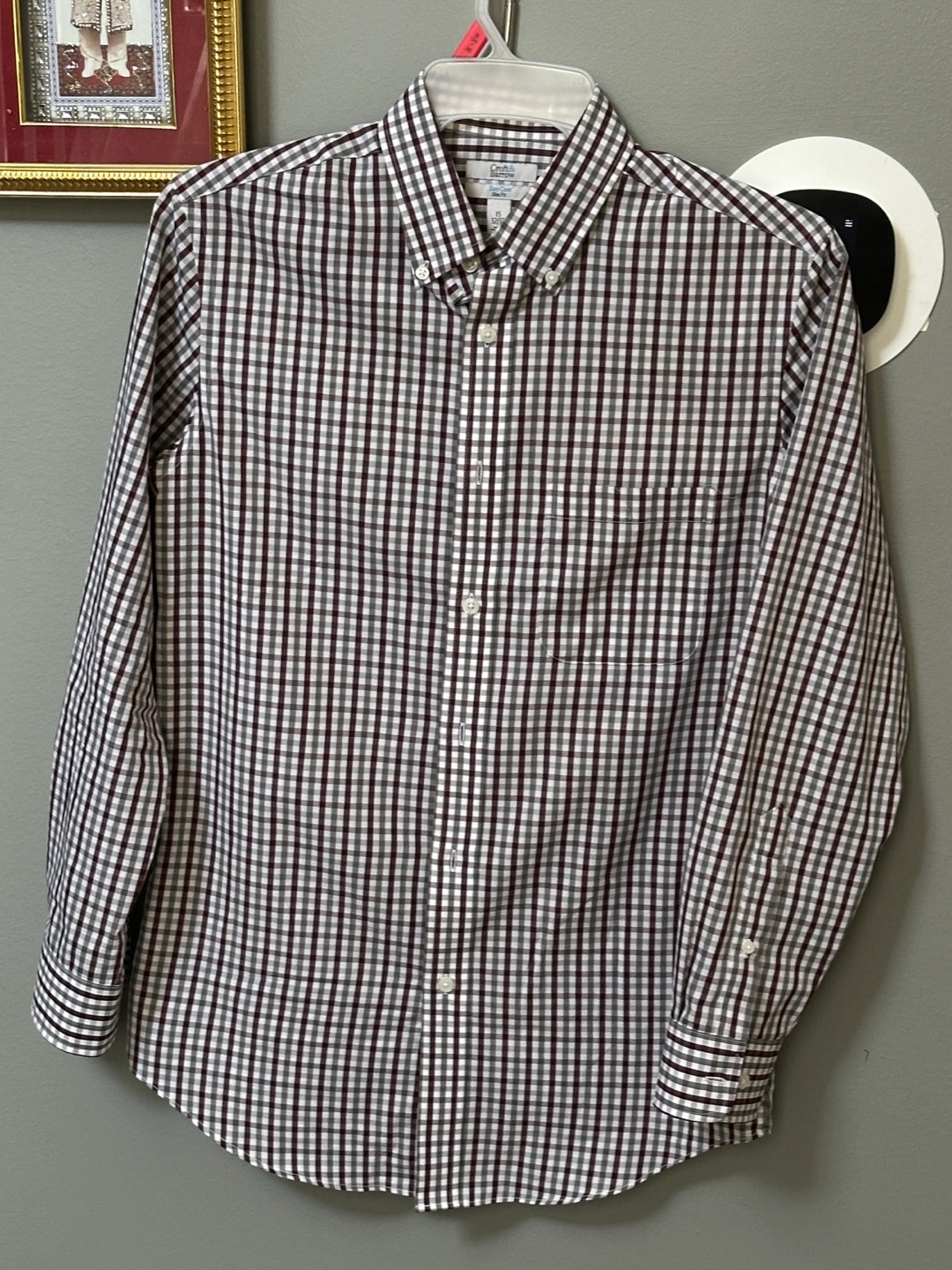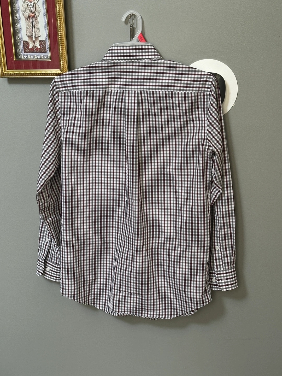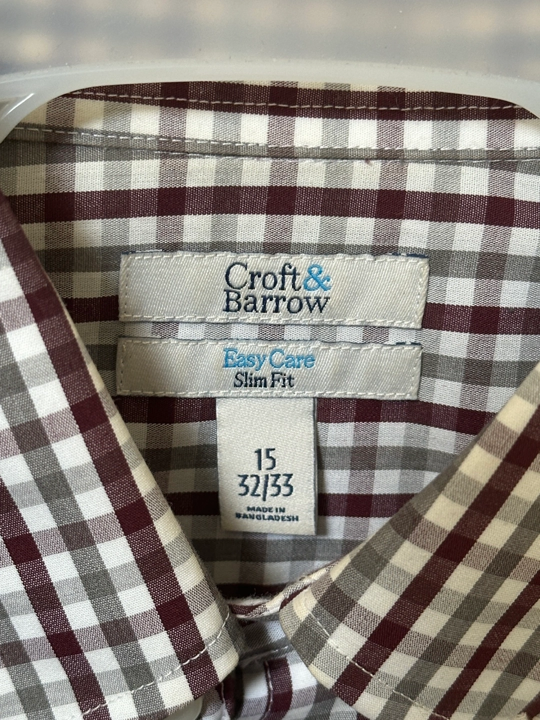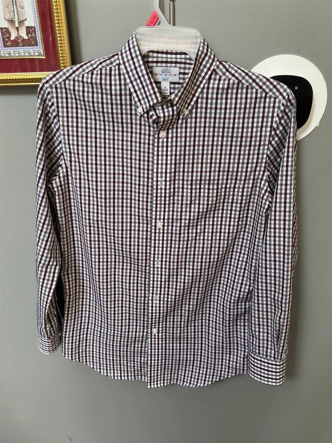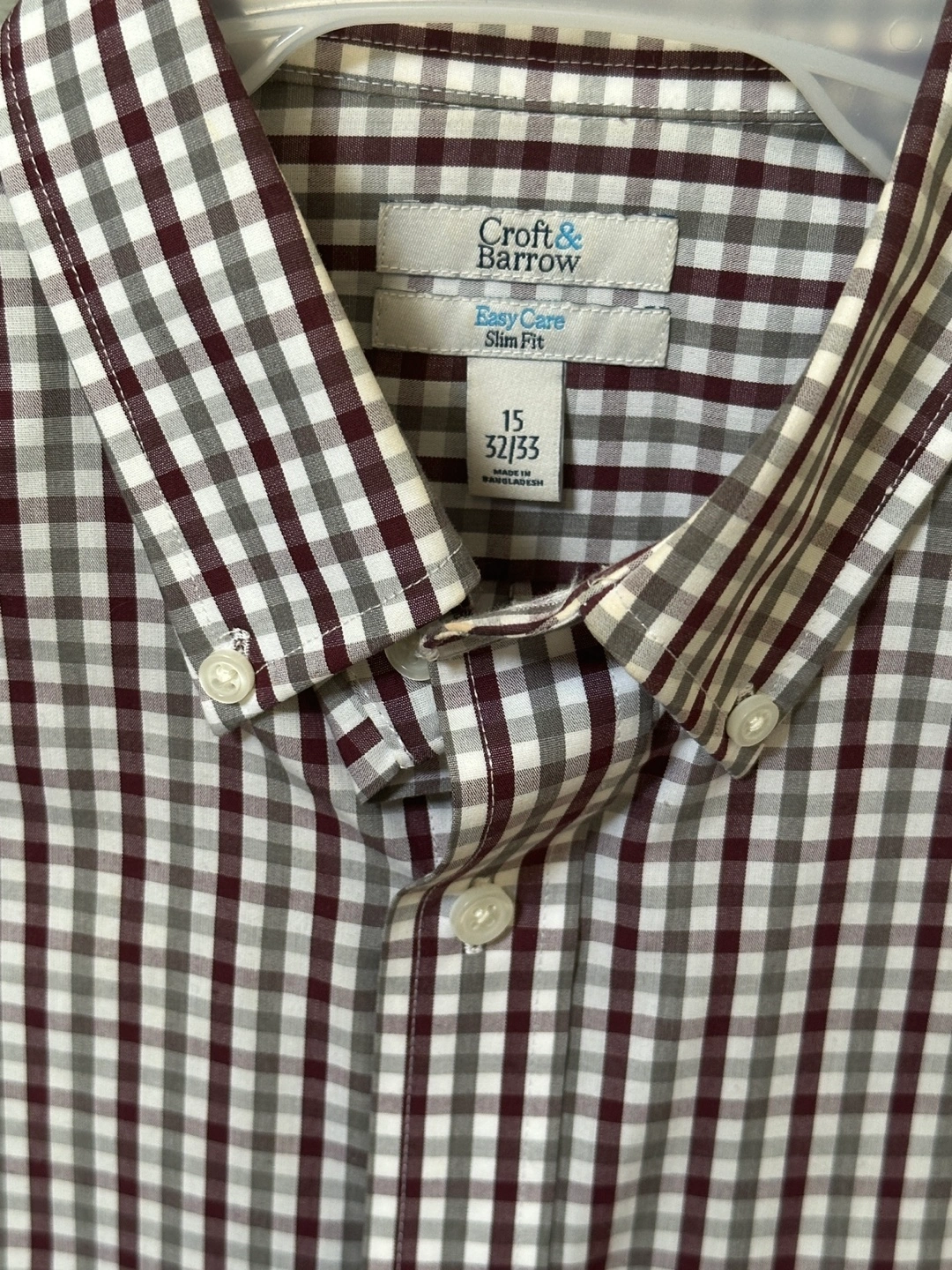 103Men's long-sleeve button-down shirt. Burgundy and gray plaid pattern. Slim fit. Easy care. Size 15/32-33. Available for local pickup by Schaumburg and Barrington Road in Schaumburg IL 60194 or shipping to your doorstep for one low price with tracking included for free. Comes from a virus free, smoke free and pet free home.