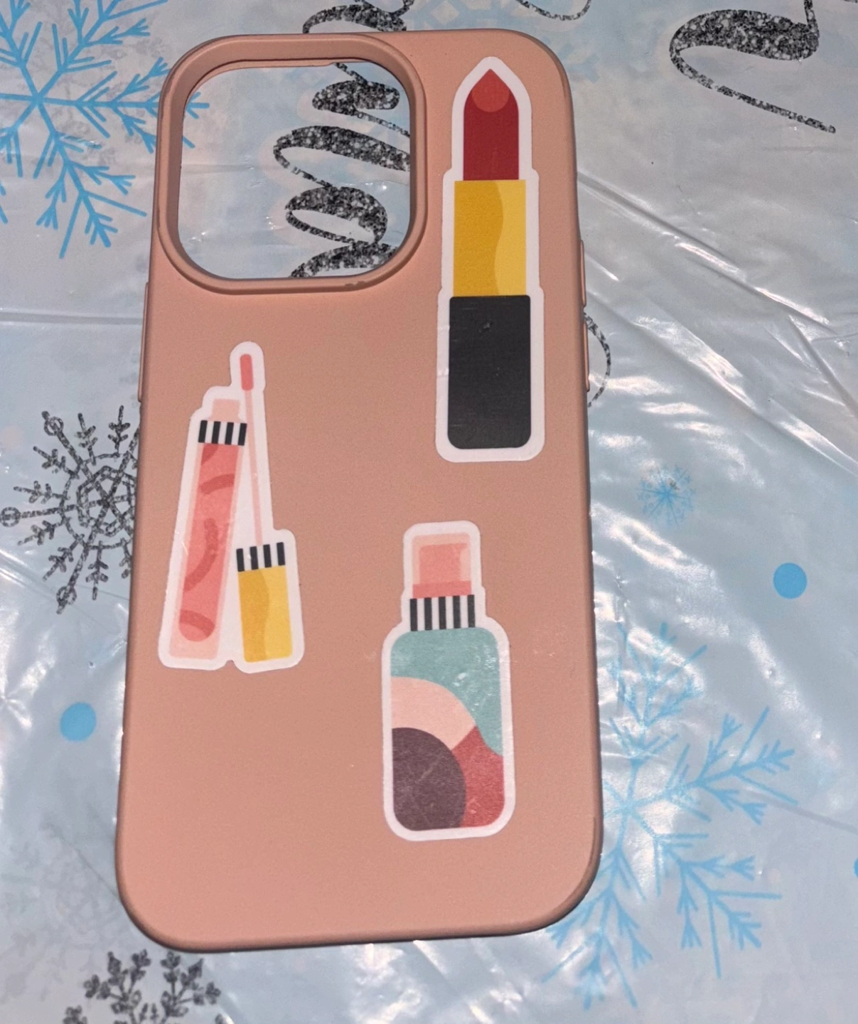 Cute phone case featuring various makeup-themed stickers. Rose-gold color. Compatible with iPhone 12 or 13 Pro models.