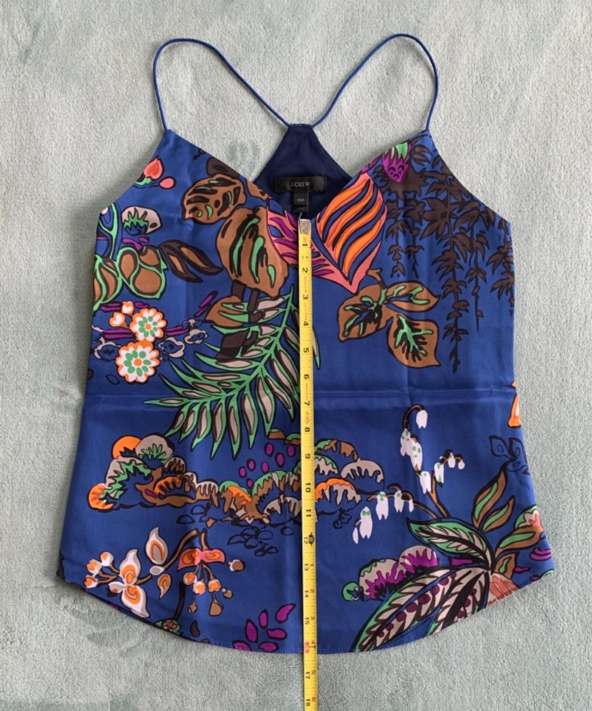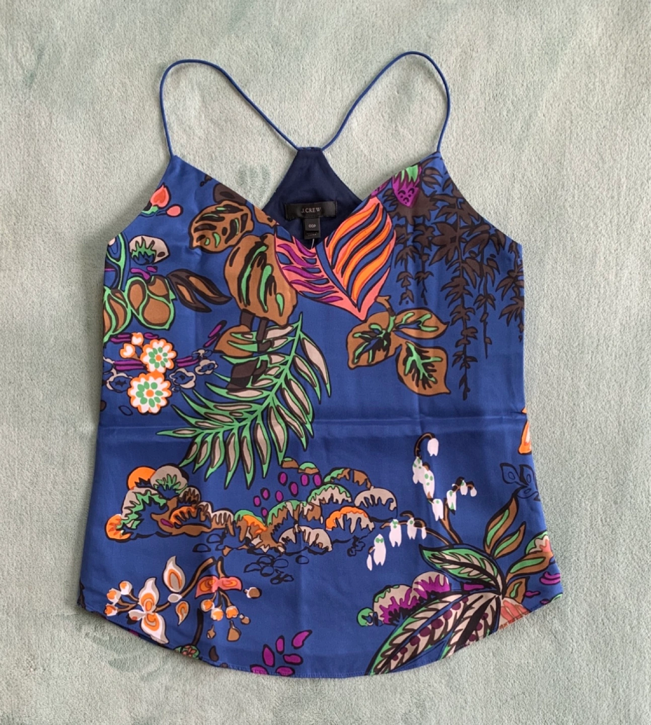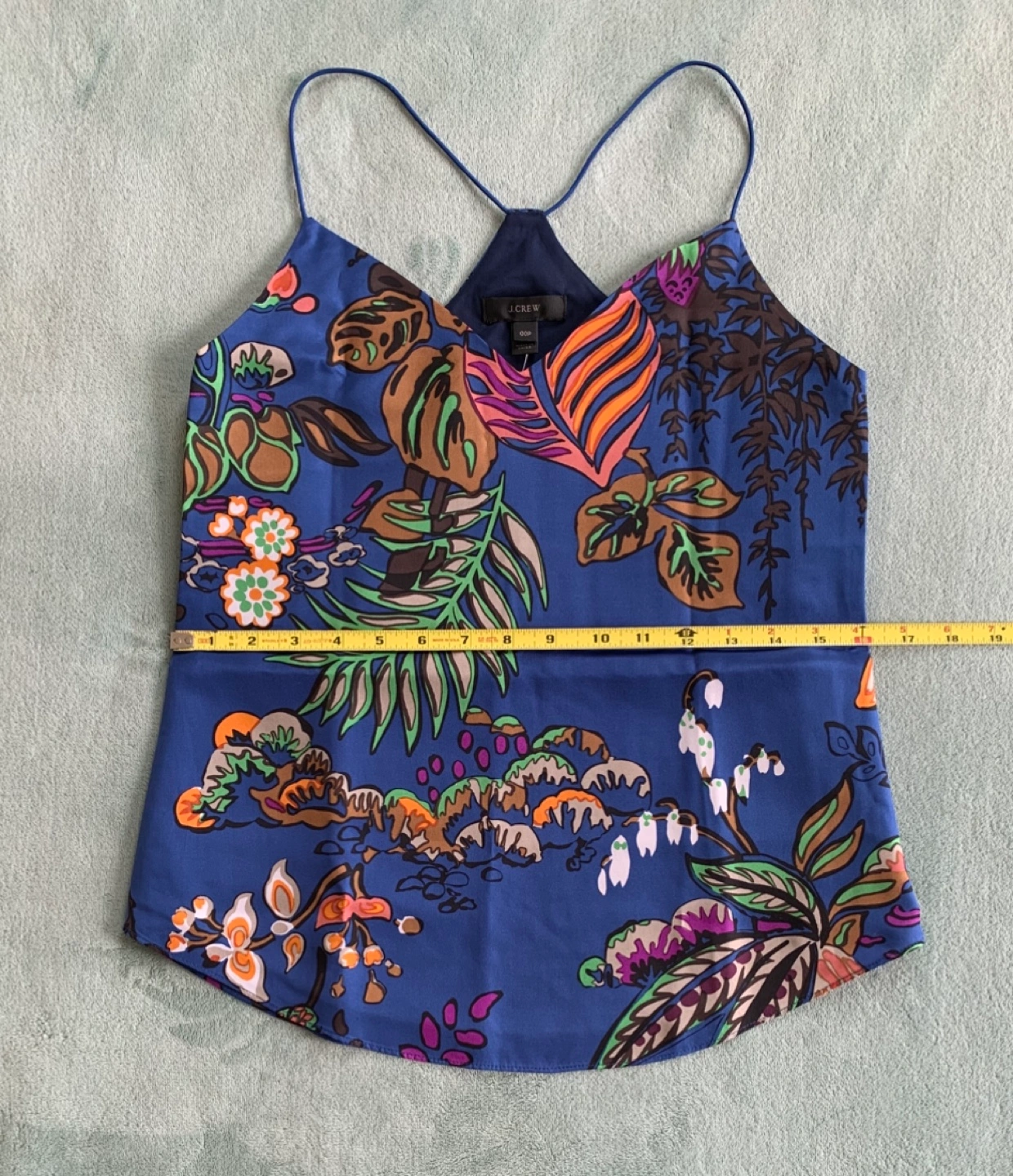 395Women's sleeveless cami top. Size 00P. Blue background with multicolored floral print. She’ll 100% silk Lining 100% polyester