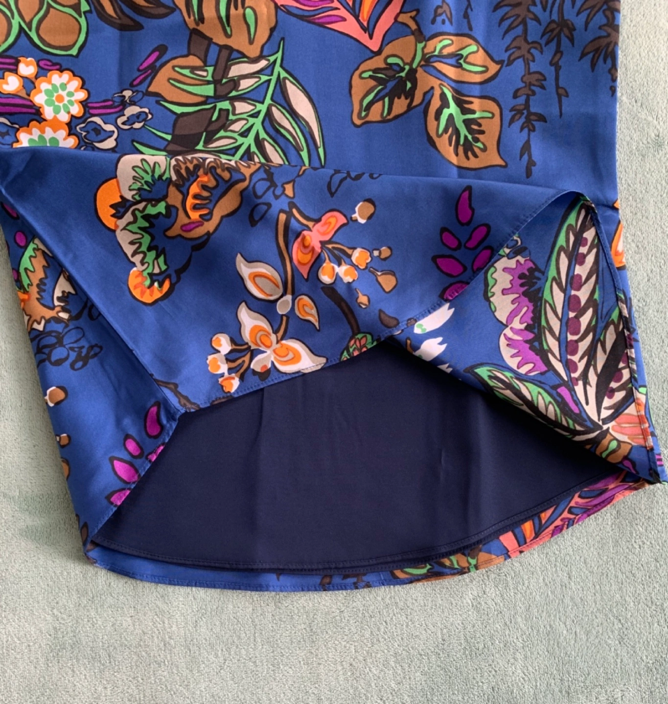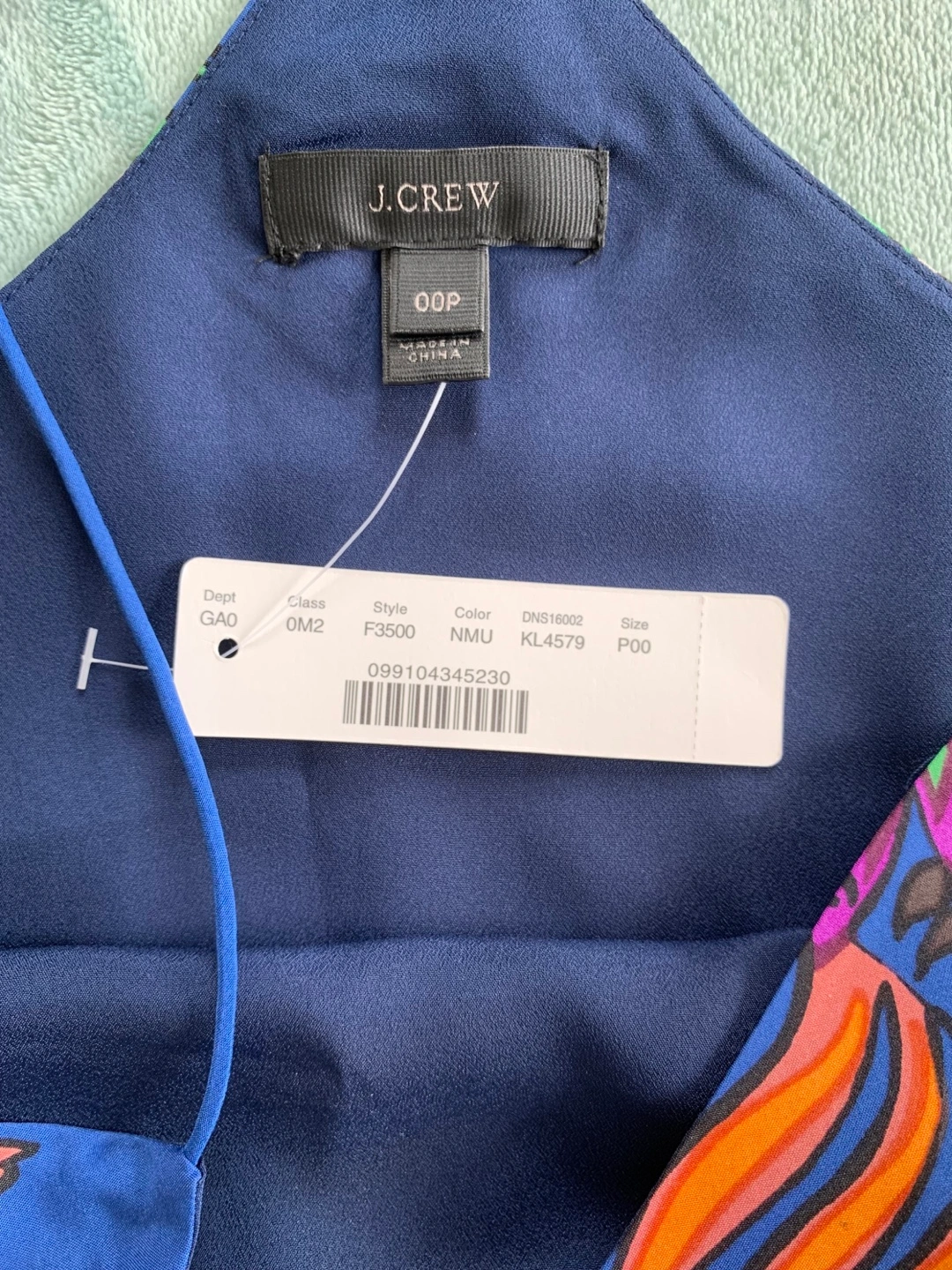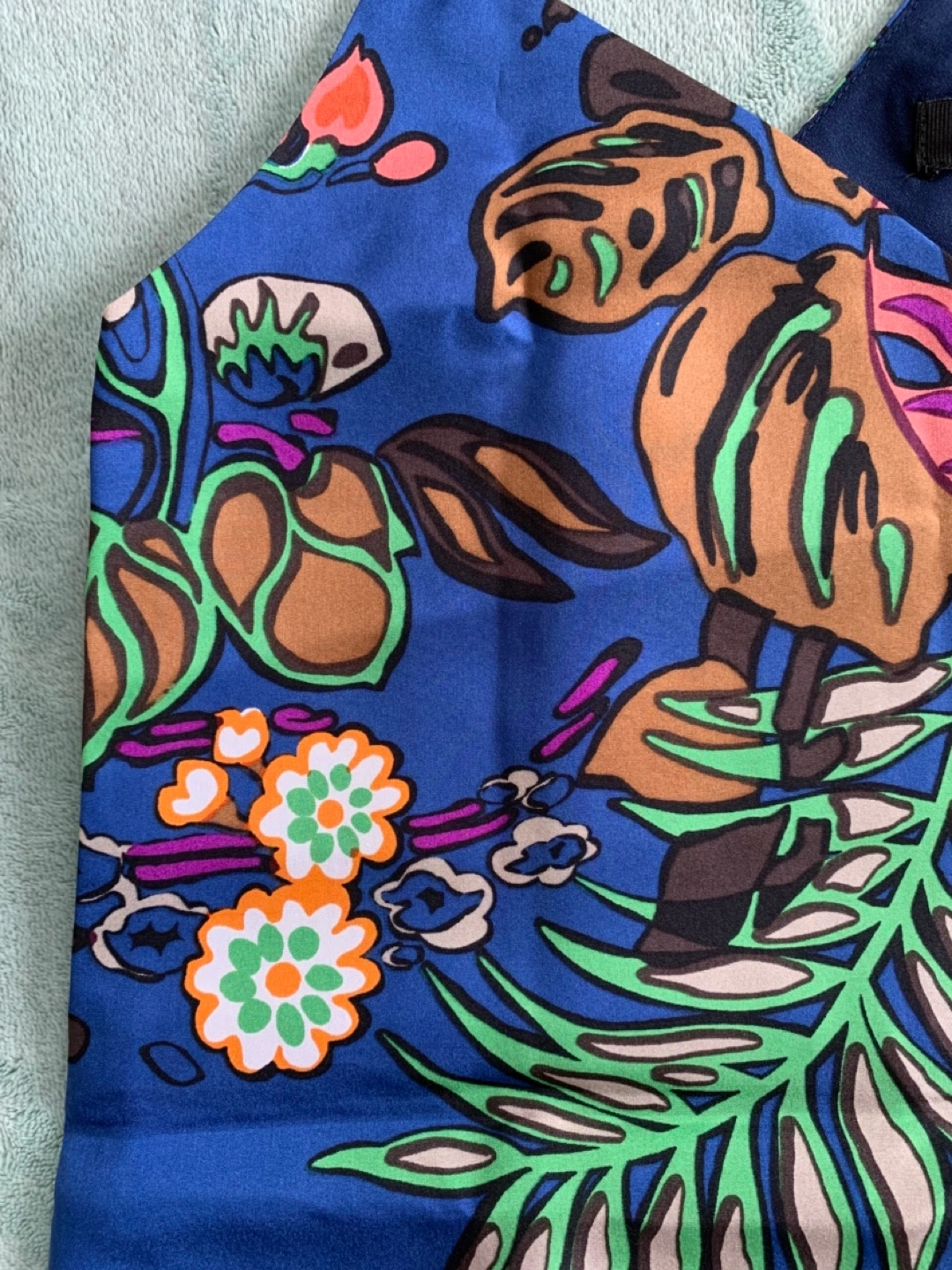 395Women's sleeveless cami top. Size 00P. Blue background with multicolored floral print. She’ll 100% silk Lining 100% polyester