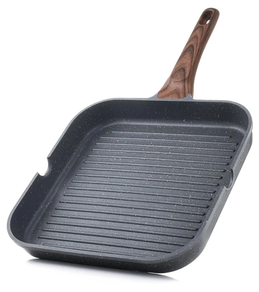 Non-stick square grill pan. Features a grooved grilling surface and a comfortable wooden handle. Great for indoor grilling.