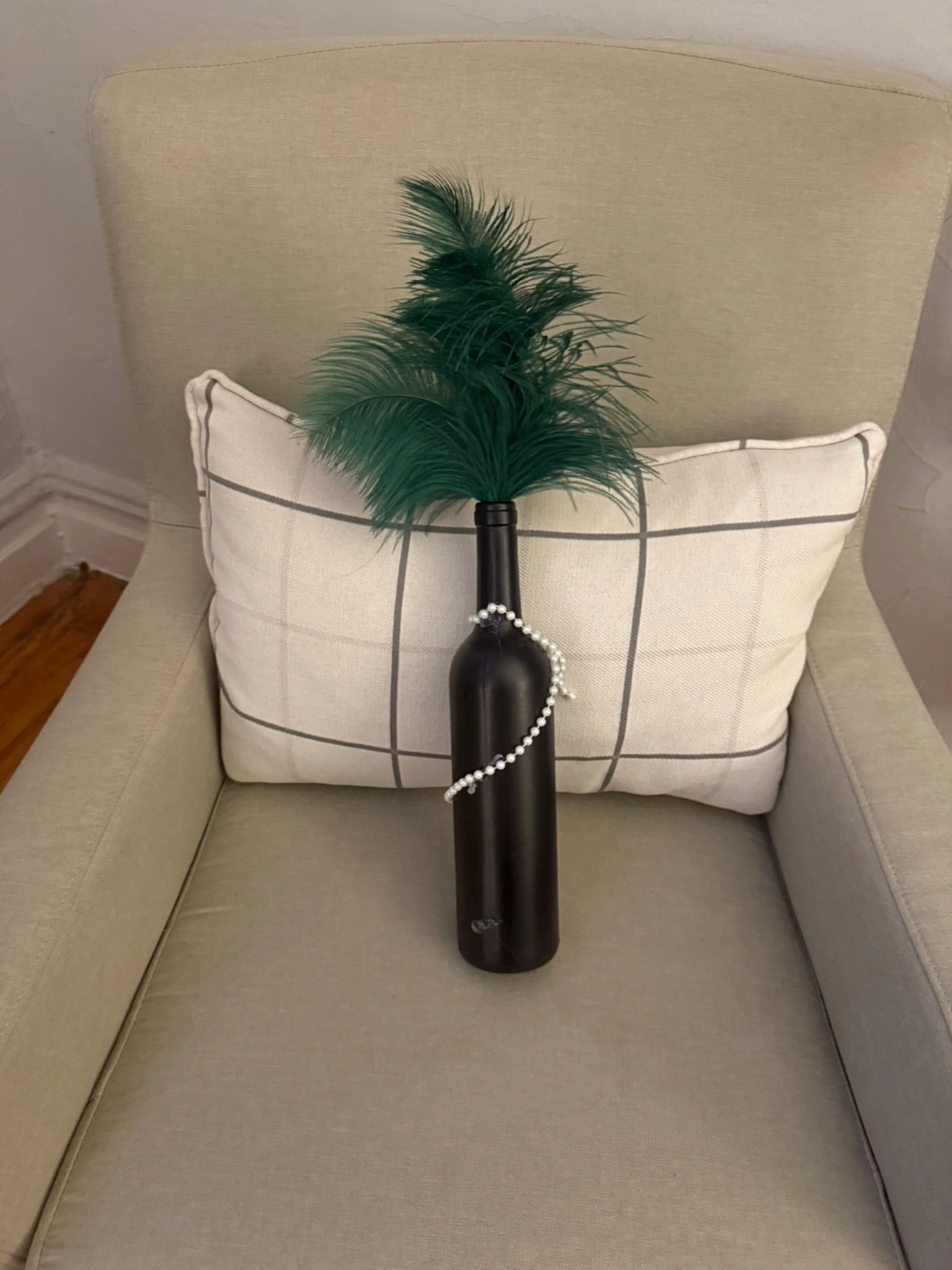 692Unique home decor. Black bottle, green feather plume, pearl necklace accents. Perfect centerpiece.