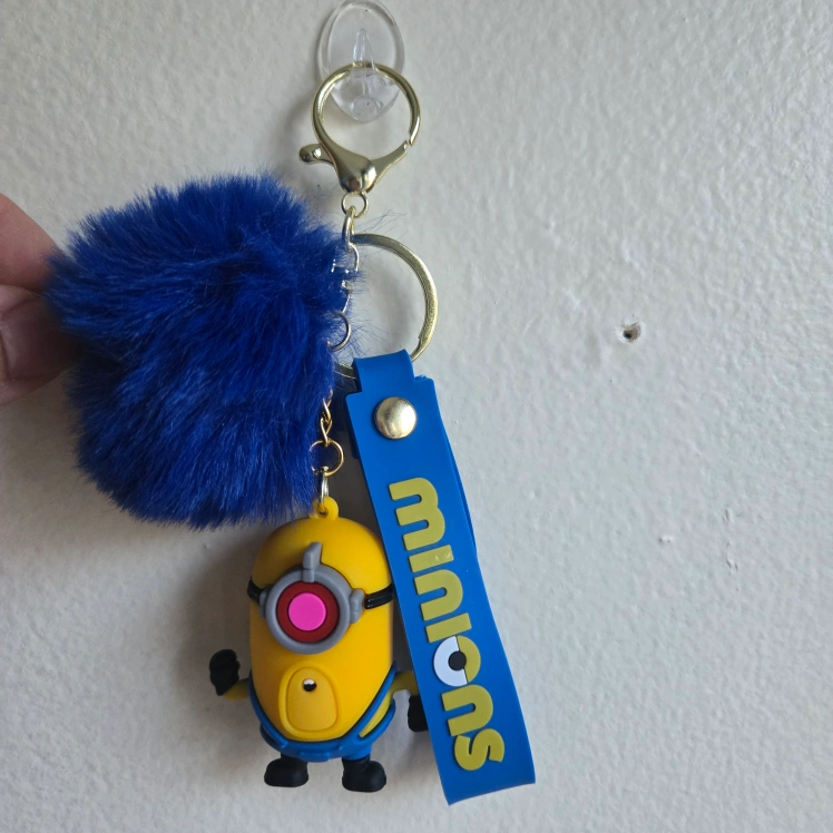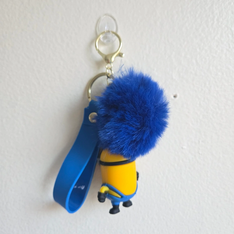 This is a handmade key chain holder with a 3D cute Minions character and features a blue pom-pom detail that adds a soft and playful texture that's hard to resist. It is made of Silicone PVC, plastic, and metal materials and features a vibrant, colorful blue and yellow design. This keychain is not just a statement piece but also a functional accessory that keeps your keys organized. The key chain is a perfect accessory for fans of the Minions characters and can serve as a fun and practical backpack clip. Proudly made by me personally, this one-size key chain is an ideal gift or a charming addition to your bag or keys.