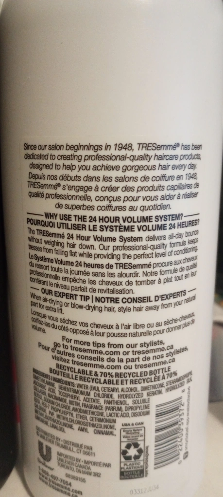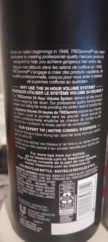 Selling an large bottles of Tresemme 24 Hour Volume Shampoo and Conditioner Size: 28 FL Oz (828 mL) Qty: 2 shampoos, 2 conditioners 0% Parabens, Dyes, Mineral Oil, DMDM Hydantoin Available for pickup **Check out my other listings and build a large bundle for delivery; minimum for delivery is $80 (depending on location)
