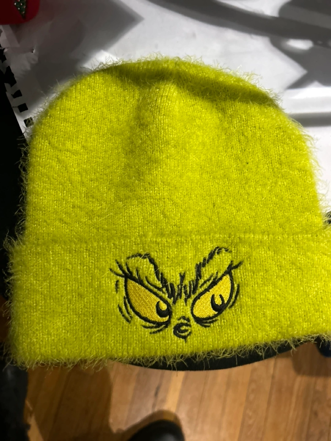 234Lime green fuzzy beanie. Features embroidered Grinch face. Soft material.