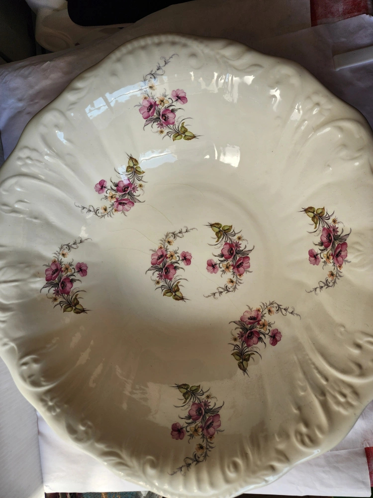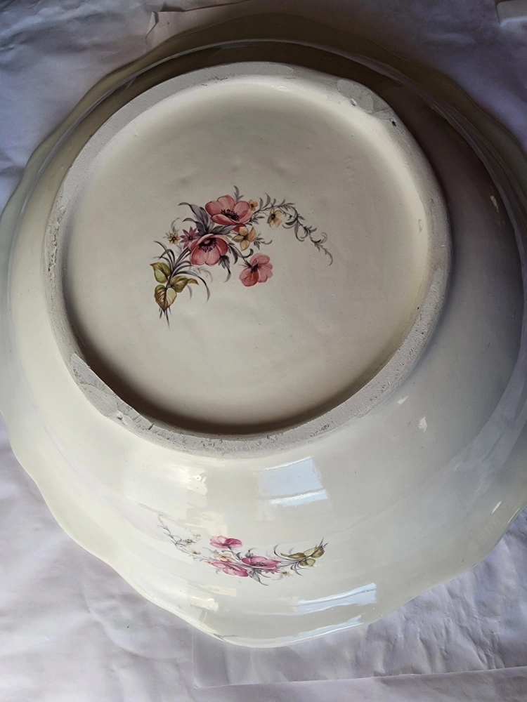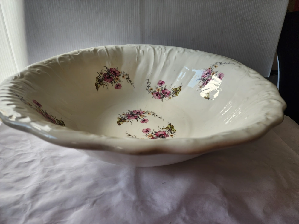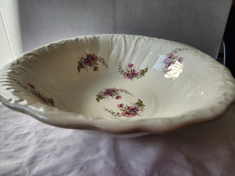 97Large vintage bowl. Cream-colored ceramic. Floral design. Scalloped edges. perfect condition 17 INCH X 16 INCH $25 Buyer has to pick up CASH ONLY