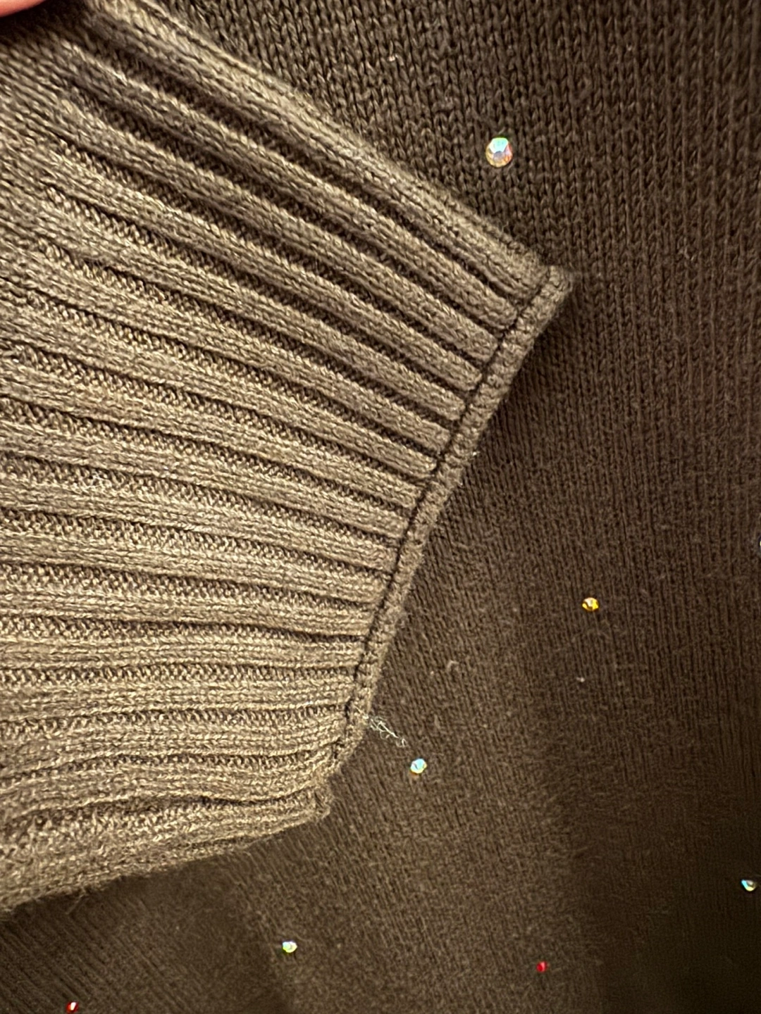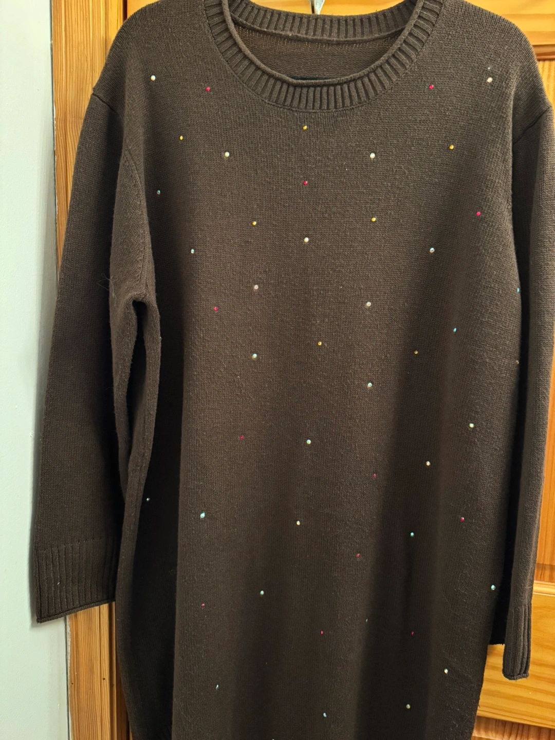 Long sleeve sweater dress. Brown knit material. Multicolored rhinestone accents. Ribbed cuffs and neckline. Stretchy - would work for XXXL in case you need it or an oversized one.