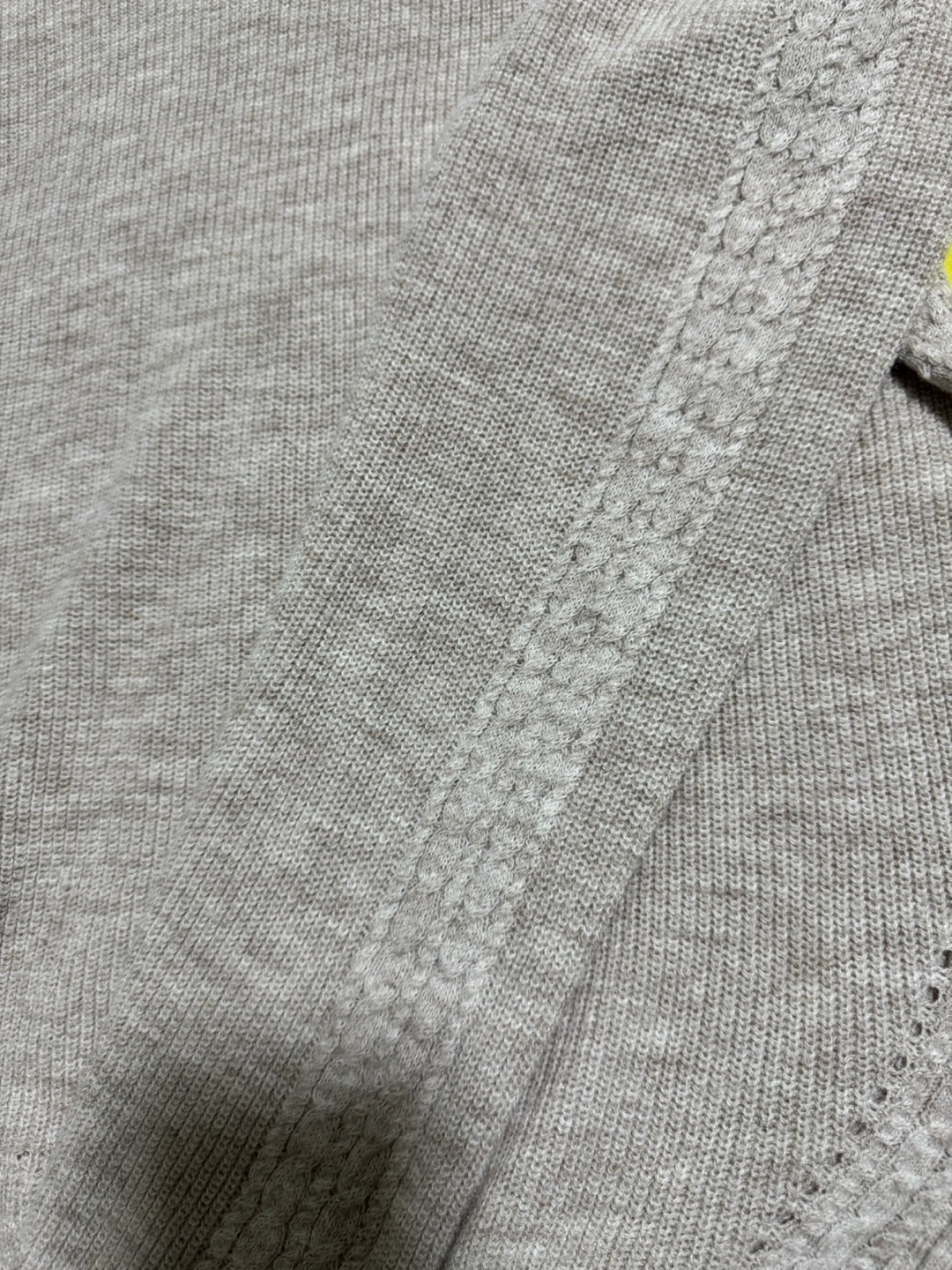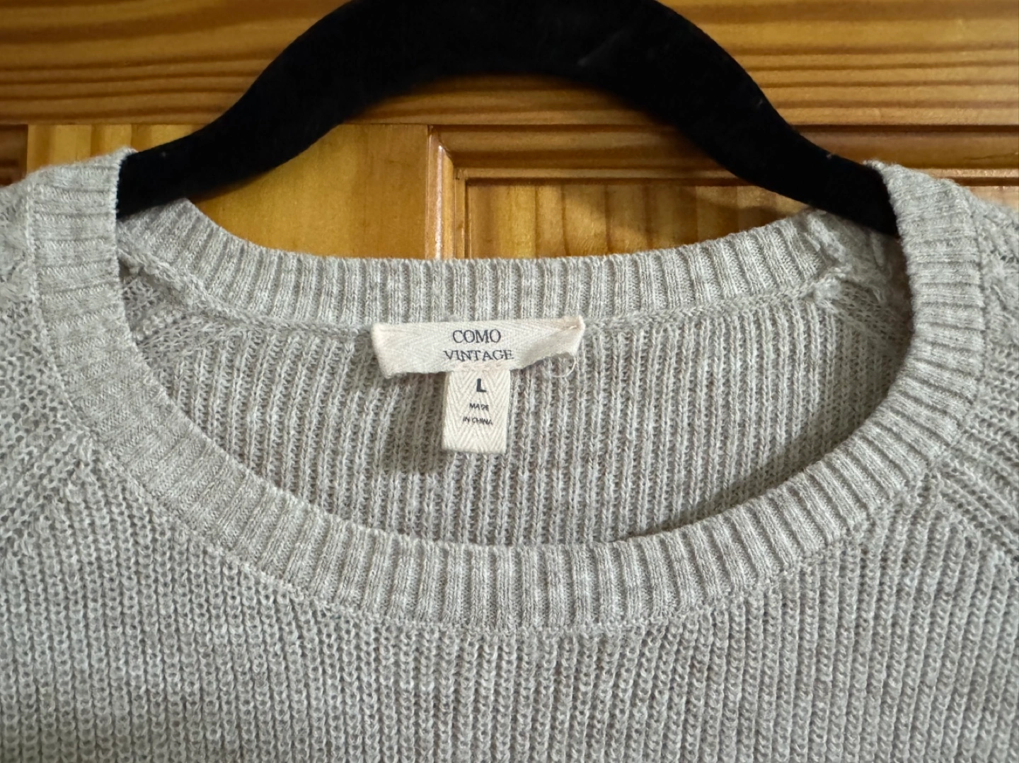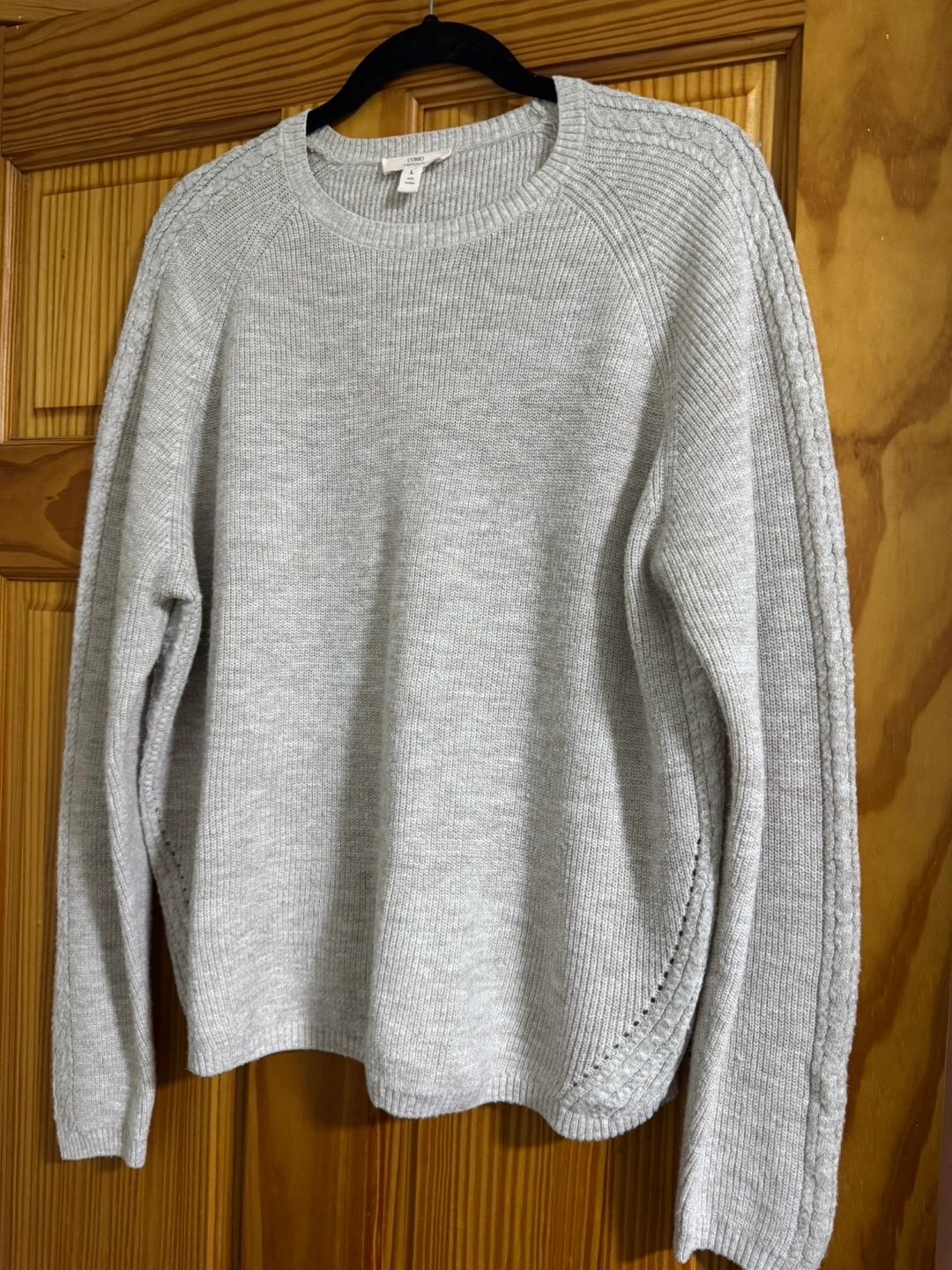 Lightweight knit sweater. Long sleeves. Crew neck. Size large. Beige color. Ribbed detailing on sleeves and hem.