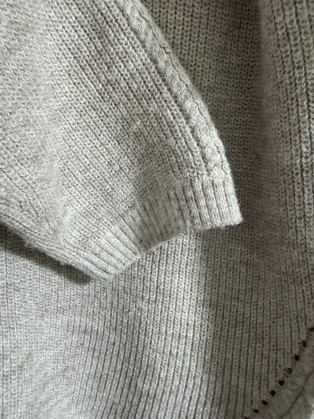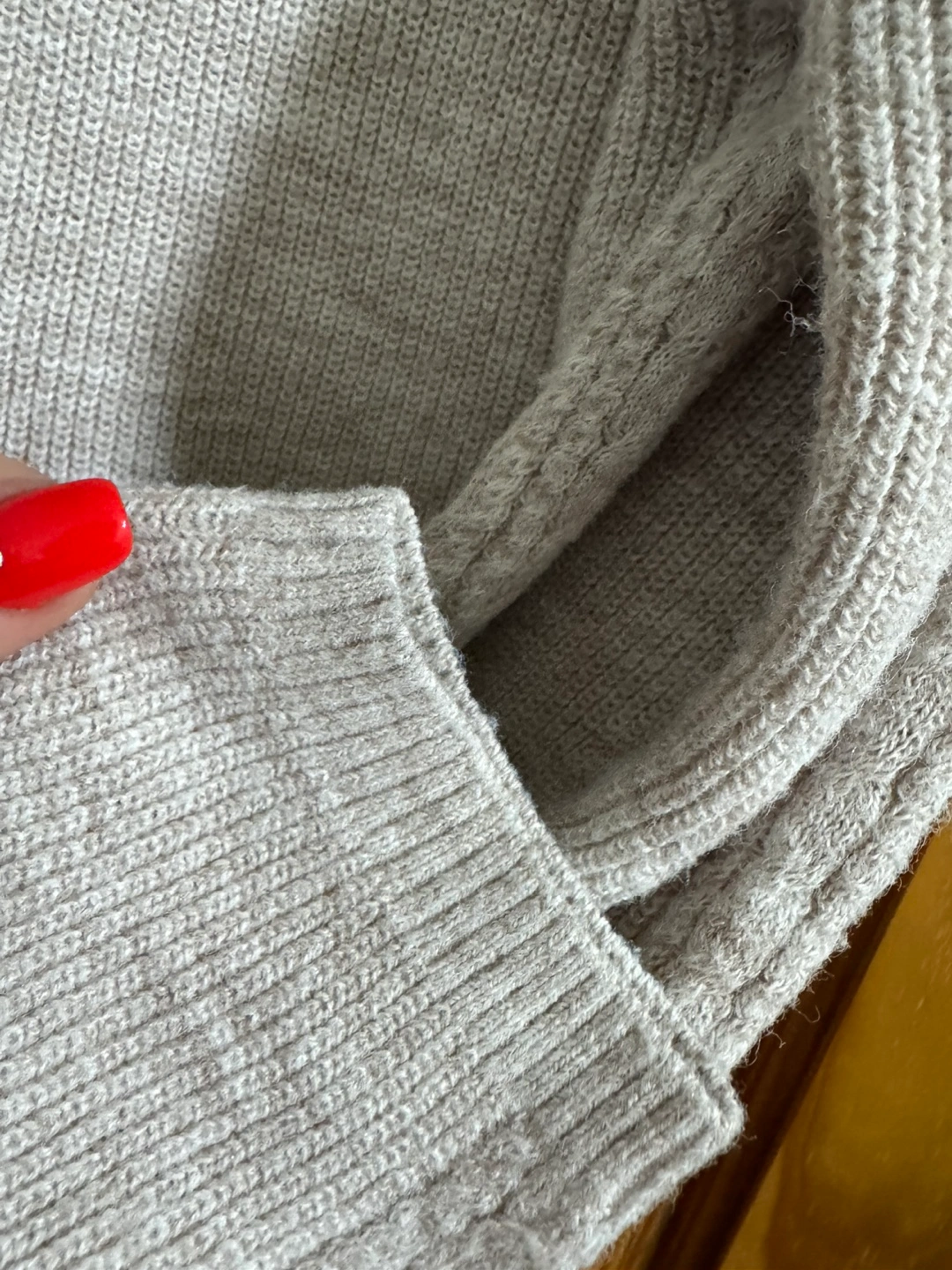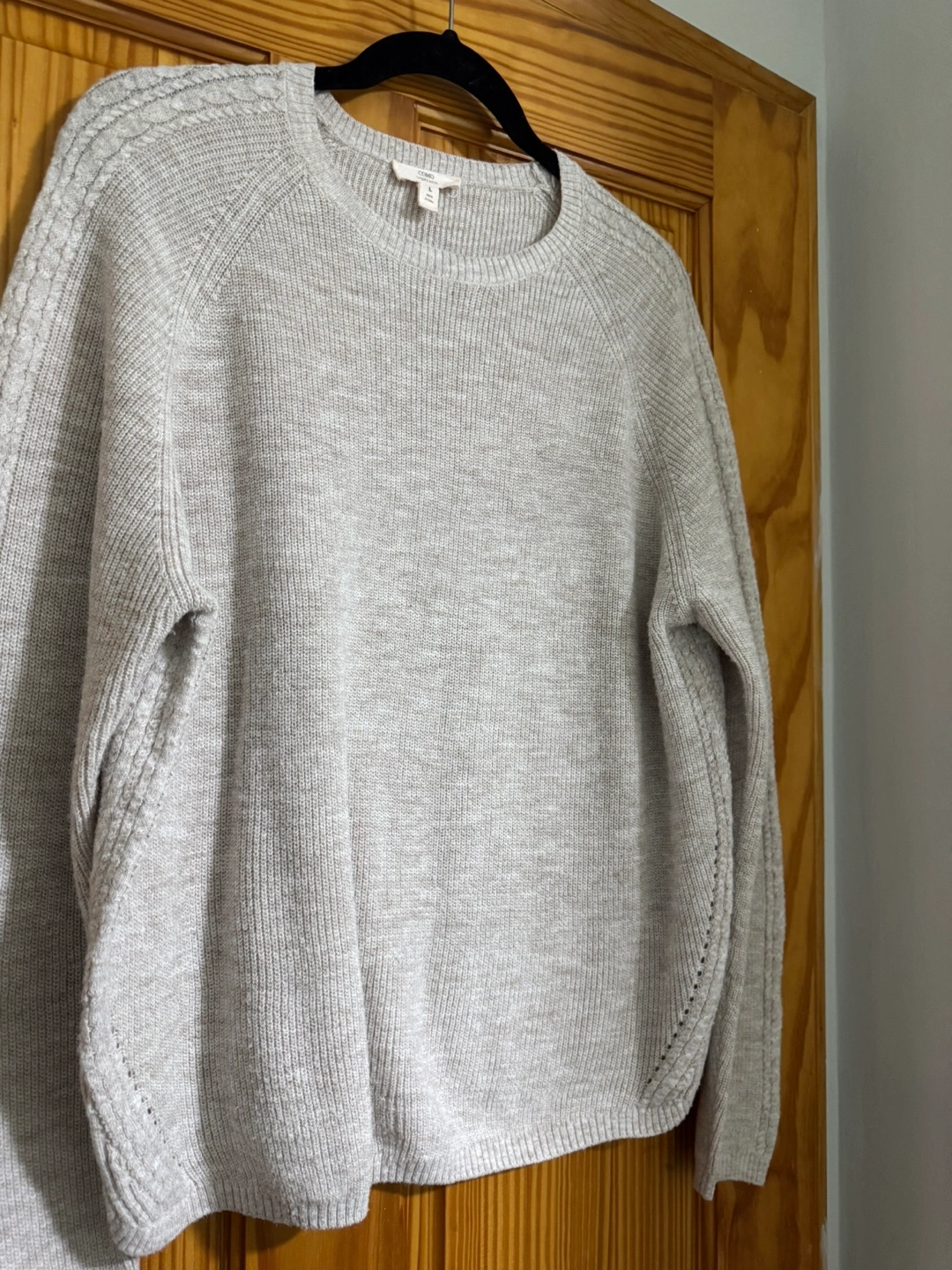 Lightweight knit sweater. Long sleeves. Crew neck. Size large. Beige color. Ribbed detailing on sleeves and hem.