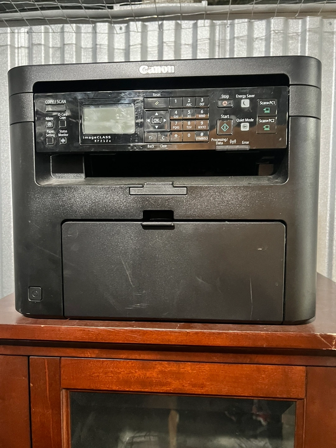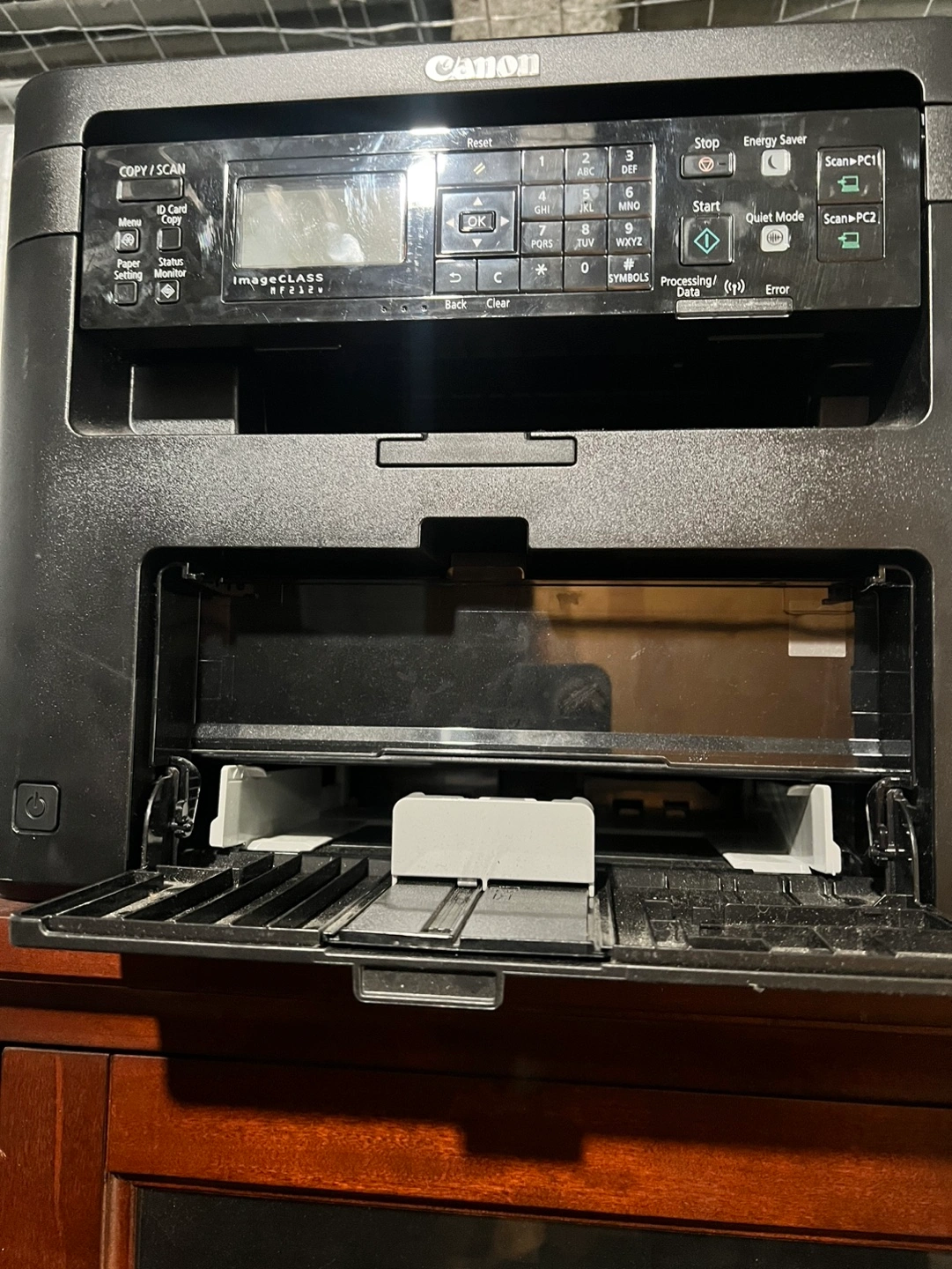 Black multifunction printer. Copy, scan, and print functions. Includes a control panel with LCD screen and number pad. Paper tray and scanner lid open and close smoothly.