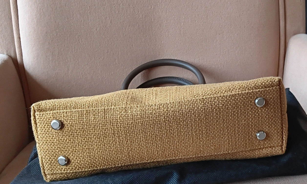 10Small tote bag. Mustard yellow woven material. Brown leather handles. Interior pockets. Dust bag included. New with tags.