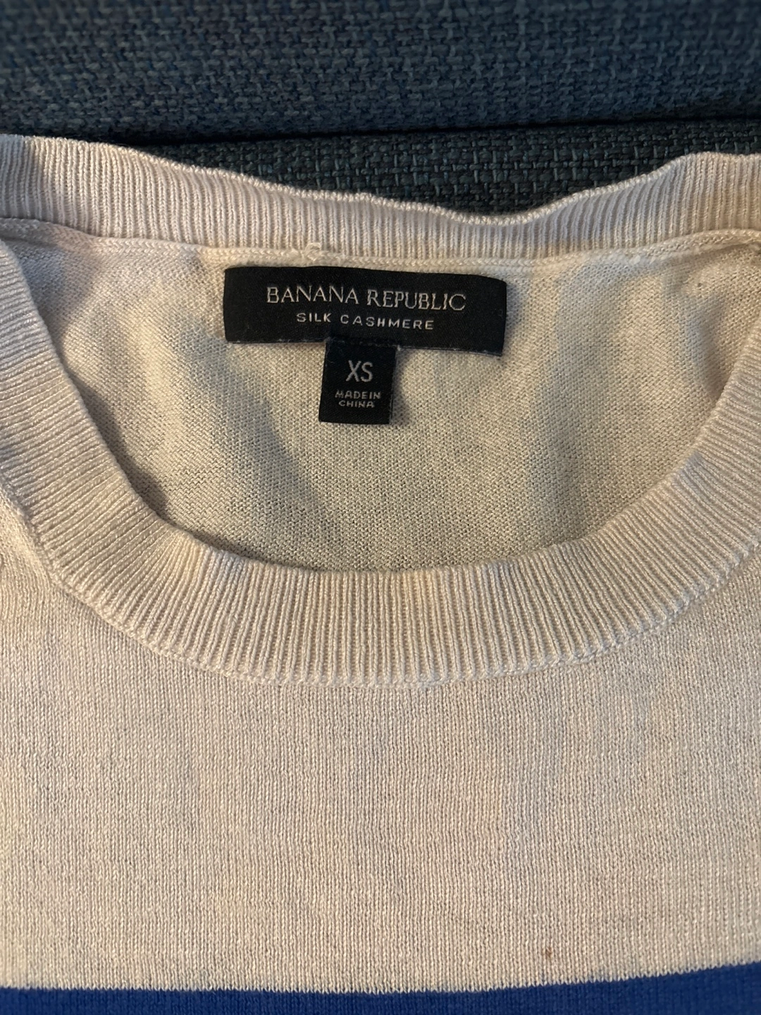 153Banana Republic silk cashmere sweater. Size extra small. Cream and blue horizontal stripes. Red trim at cuffs and bottom hem. Long sleeves. Crew neck. Only used once, and been sitting in my closet since.