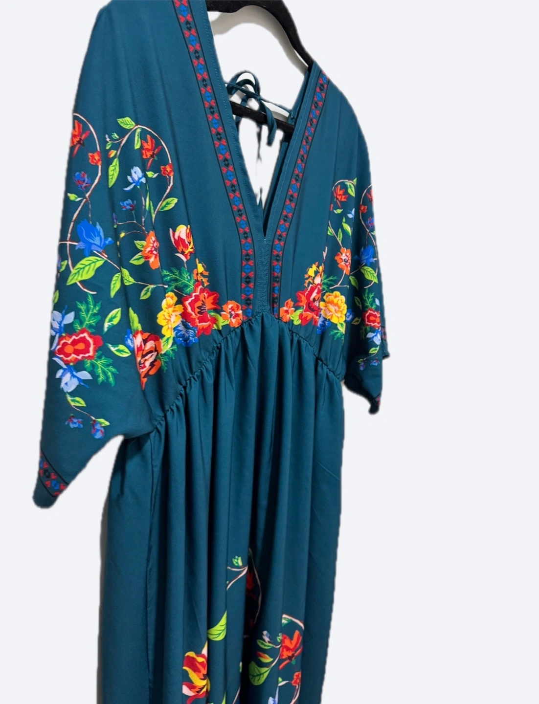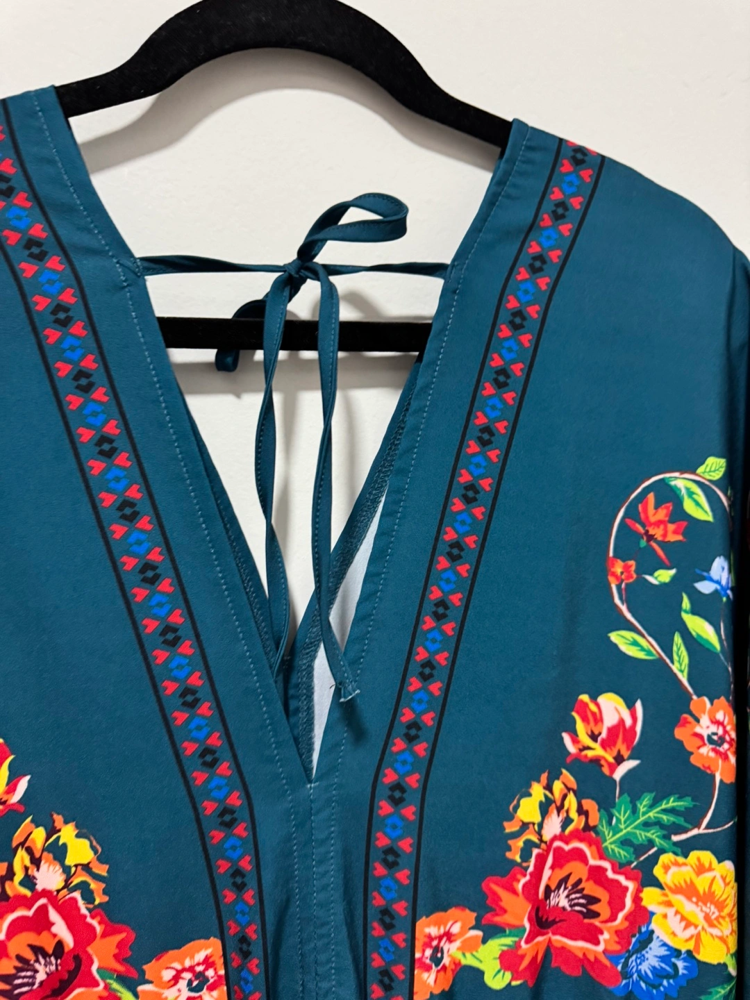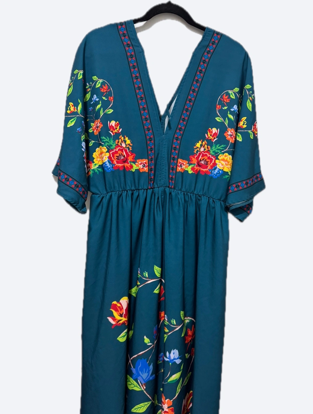 Beautiful teal maxi dress. Features a V-neckline with a tie closure at the back. Short sleeves, empire waist, and vibrant floral print. Flowy and comfortable.