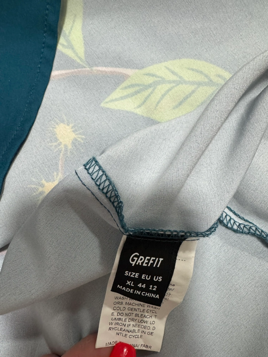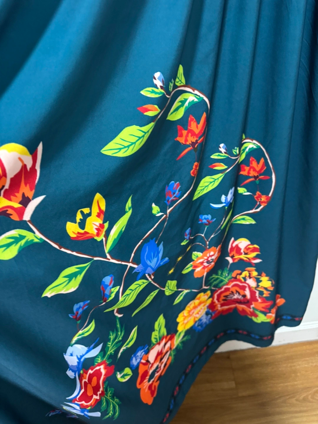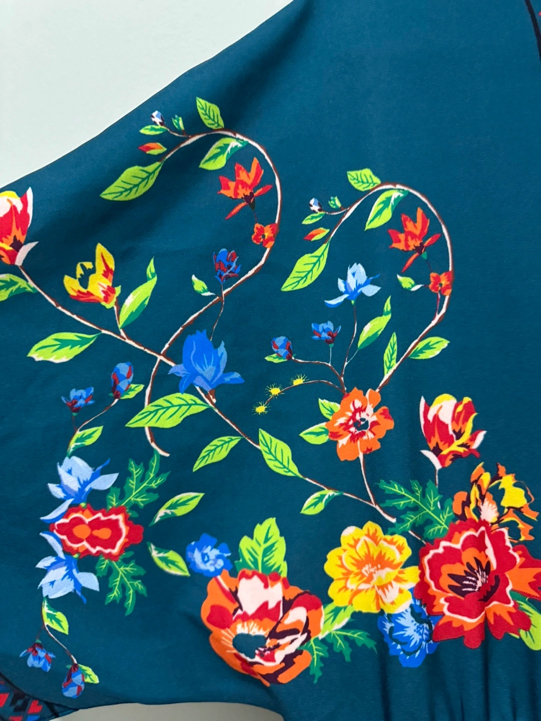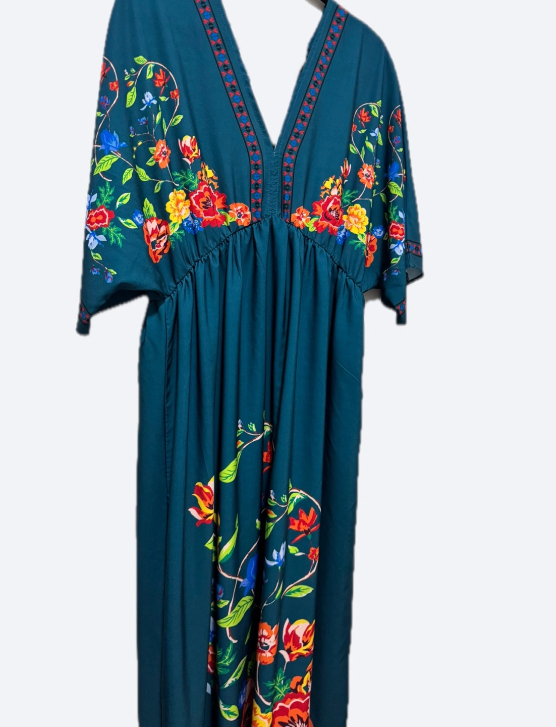 Beautiful teal maxi dress. Features a V-neckline with a tie closure at the back. Short sleeves, empire waist, and vibrant floral print. Flowy and comfortable.