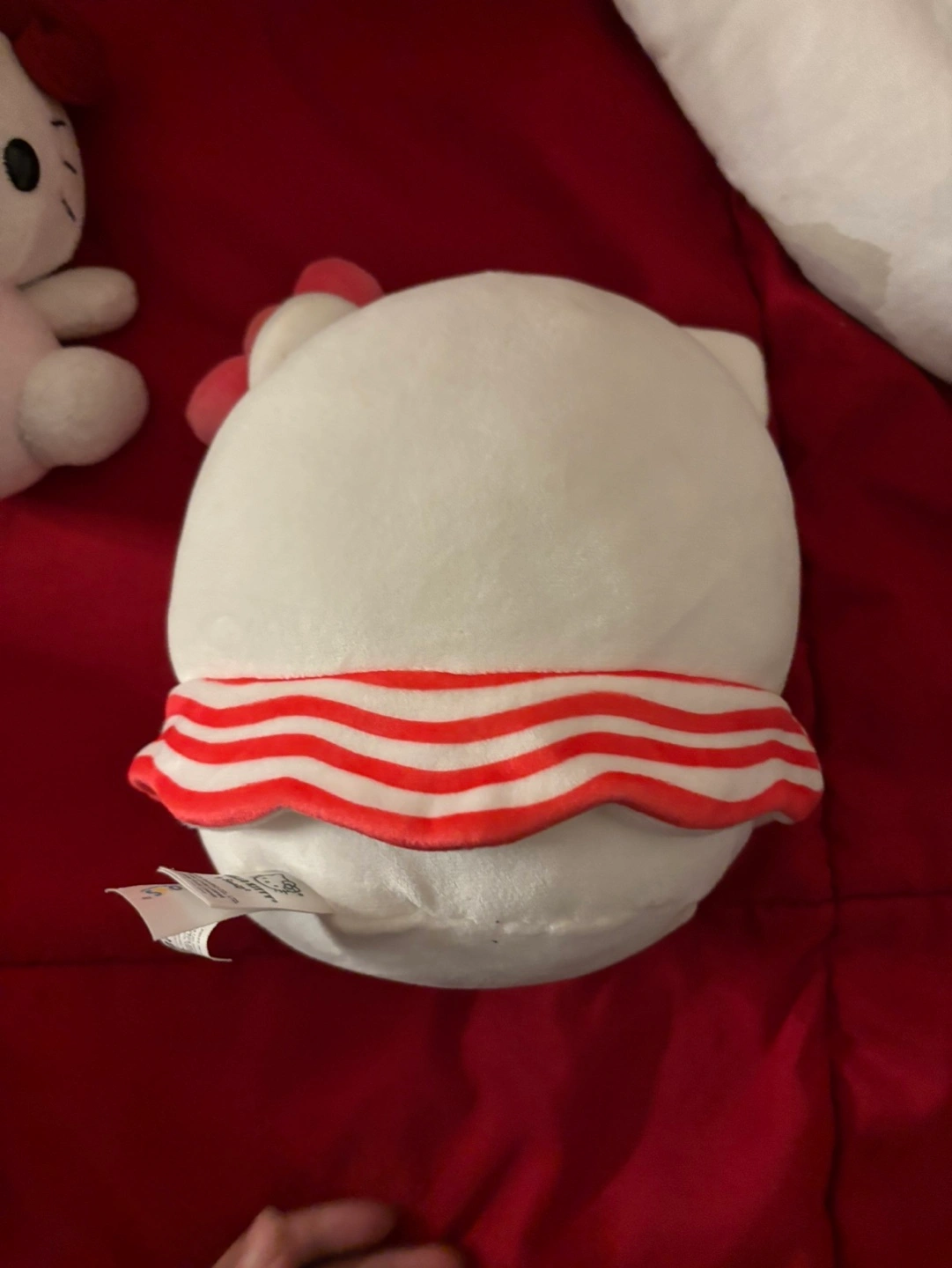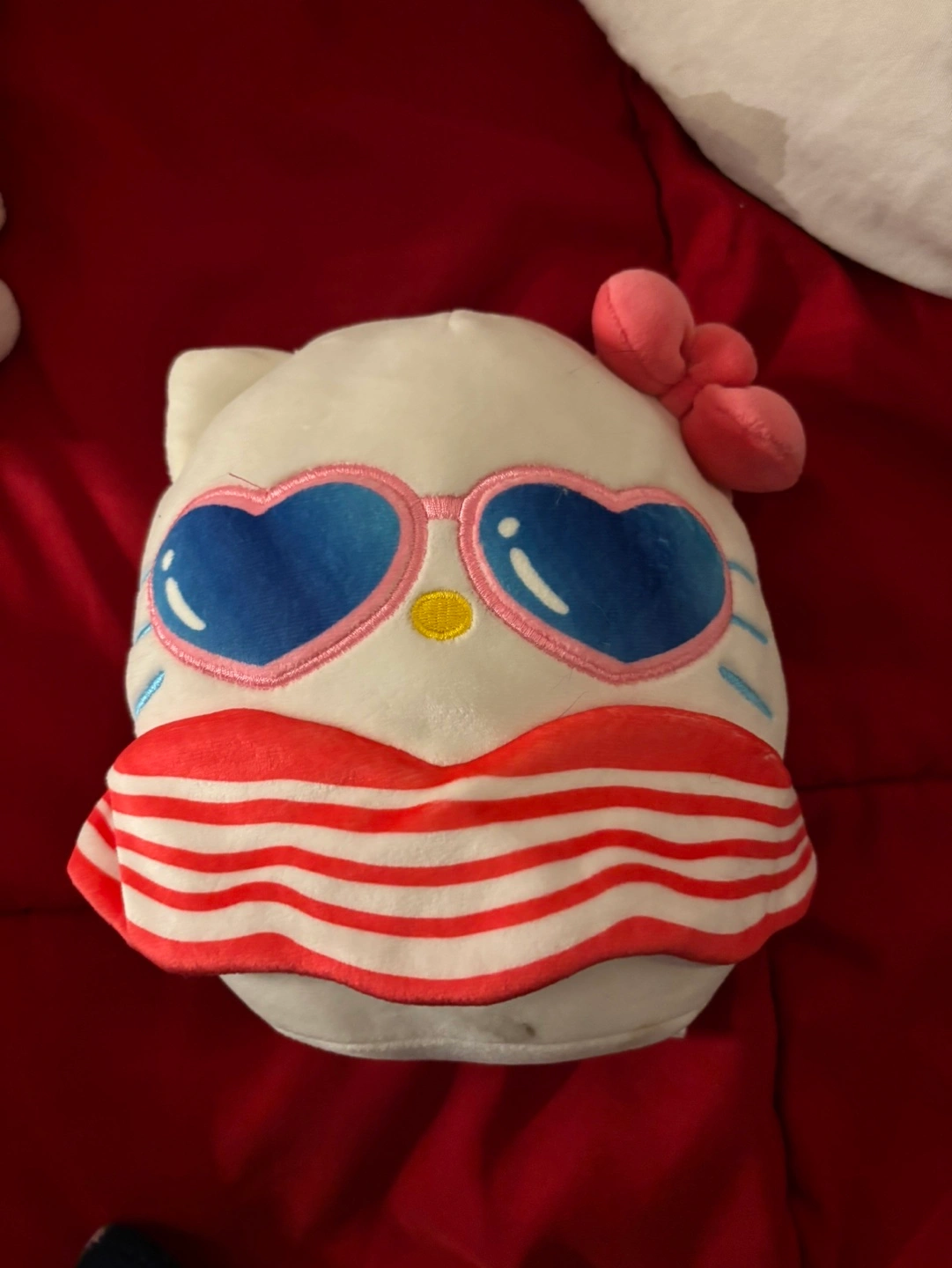 174Adorable Hello Kitty plush toy. Summer theme. Red and white striped bottom. Heart-shaped sunglasses. Small size, perfect for collectors.