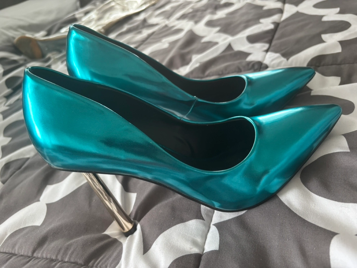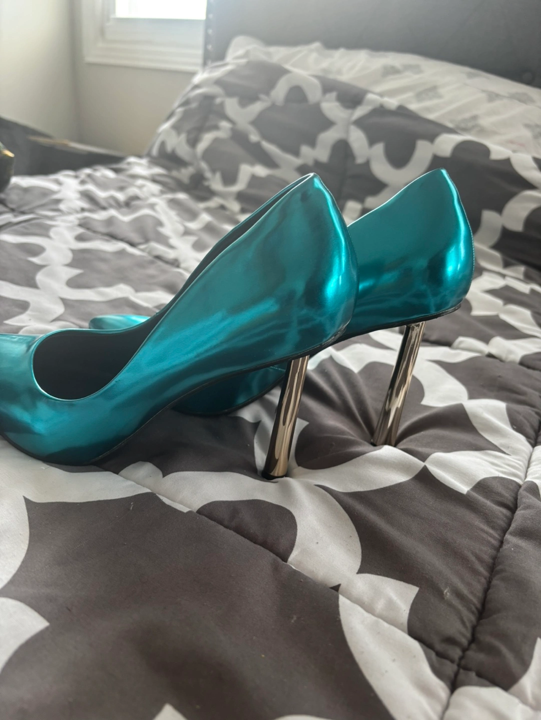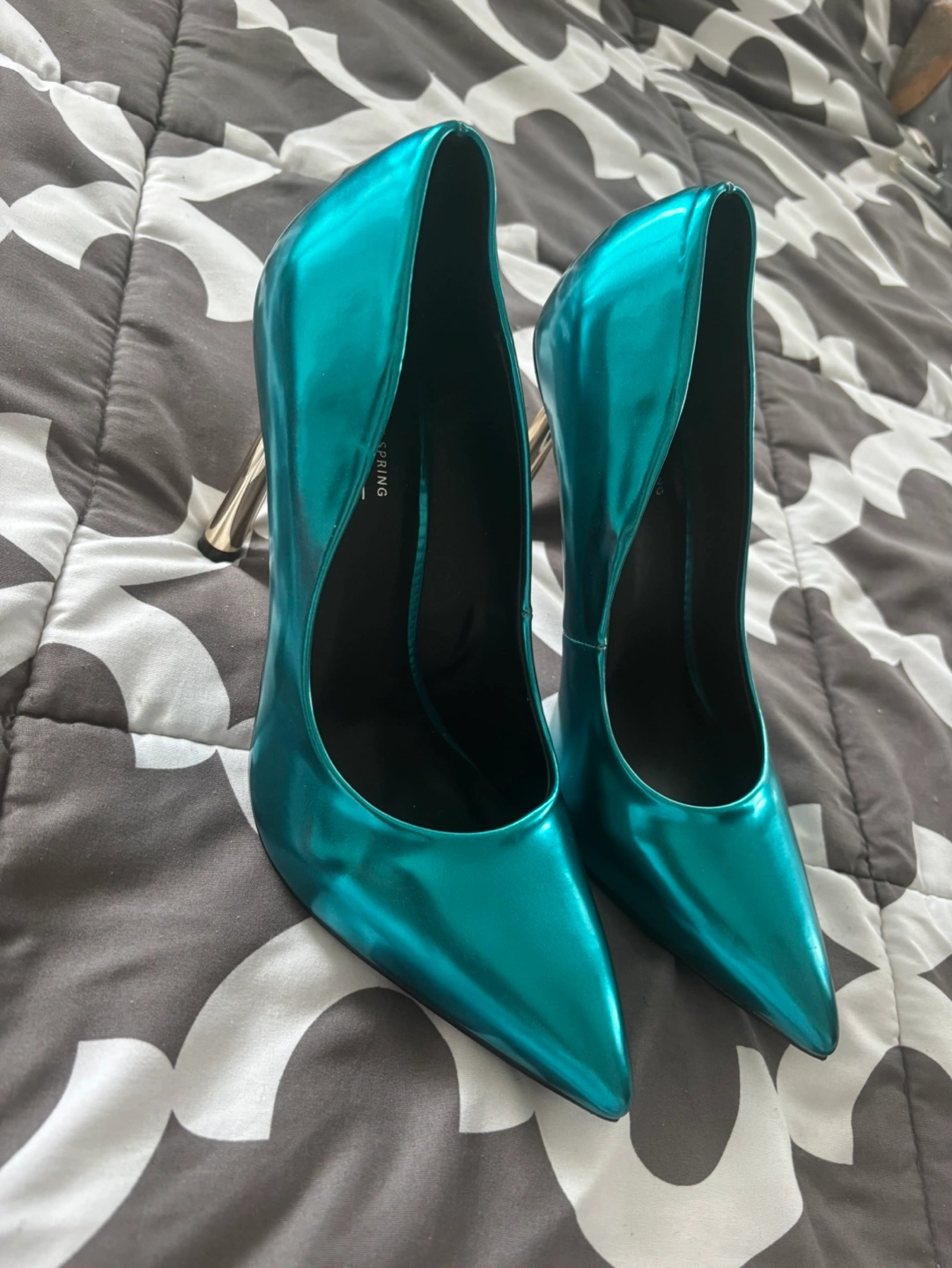 60Stunning teal metallic high heels. Pointed-toe design. Vegan and sustainable materials. Metal stiletto heels. Size 10