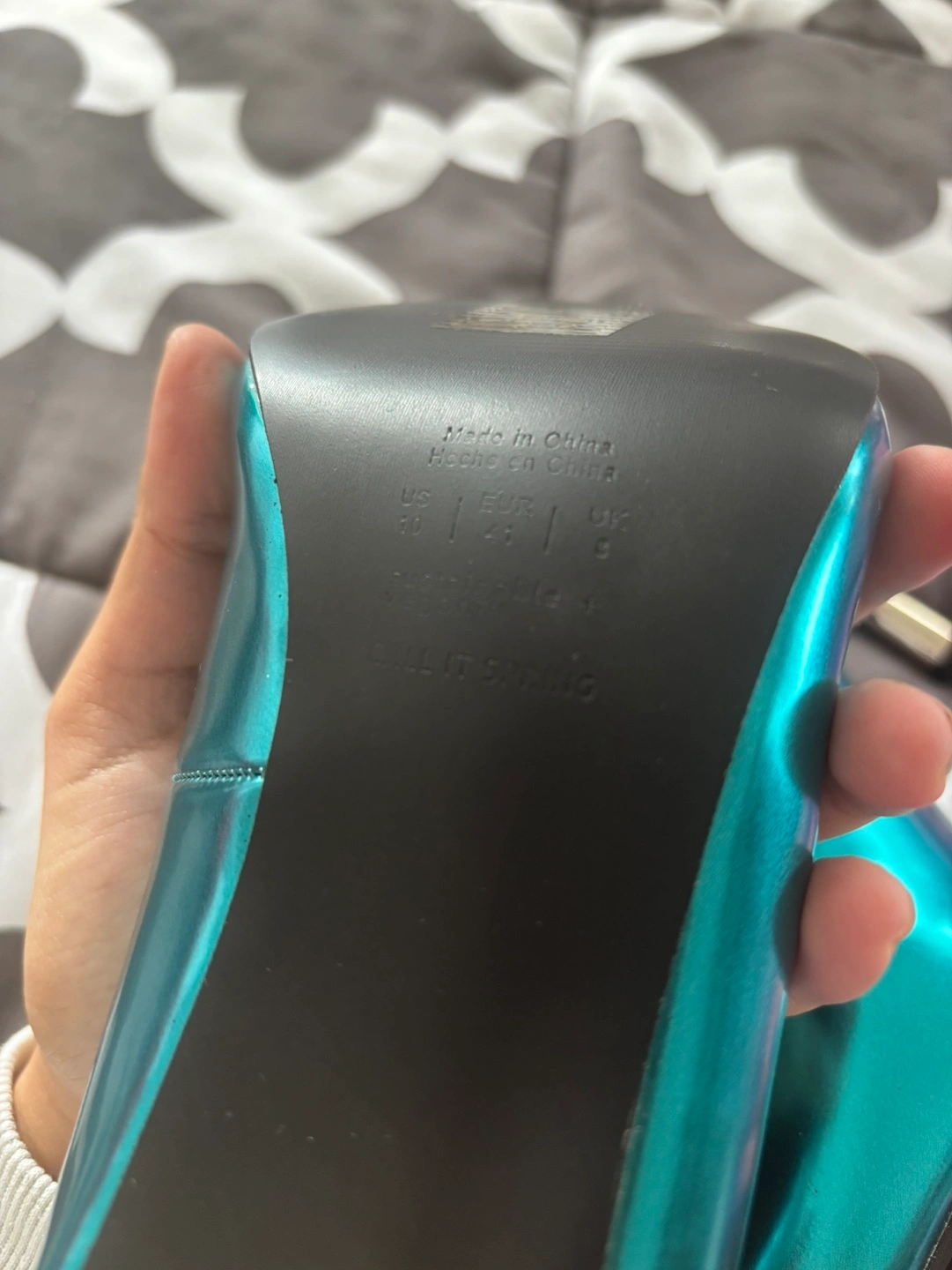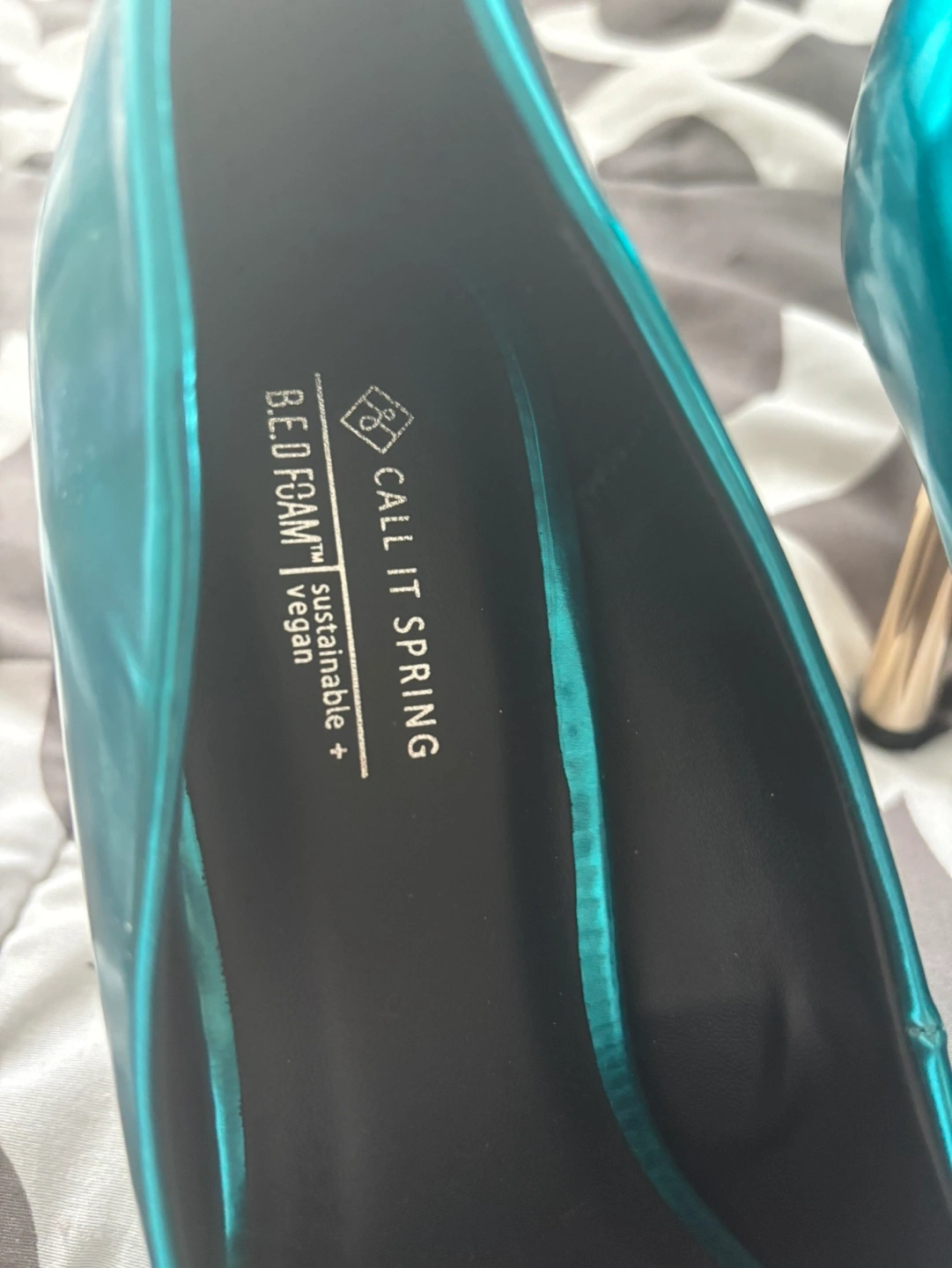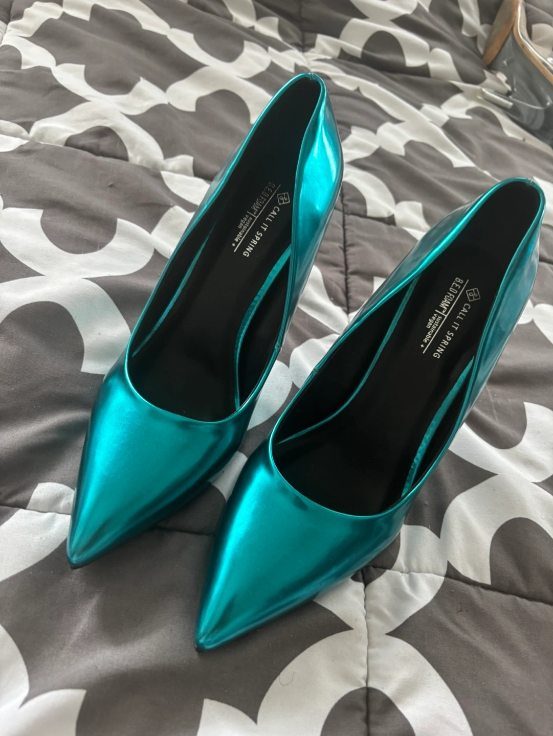 60Stunning teal metallic high heels. Pointed-toe design. Vegan and sustainable materials. Metal stiletto heels. Size 10