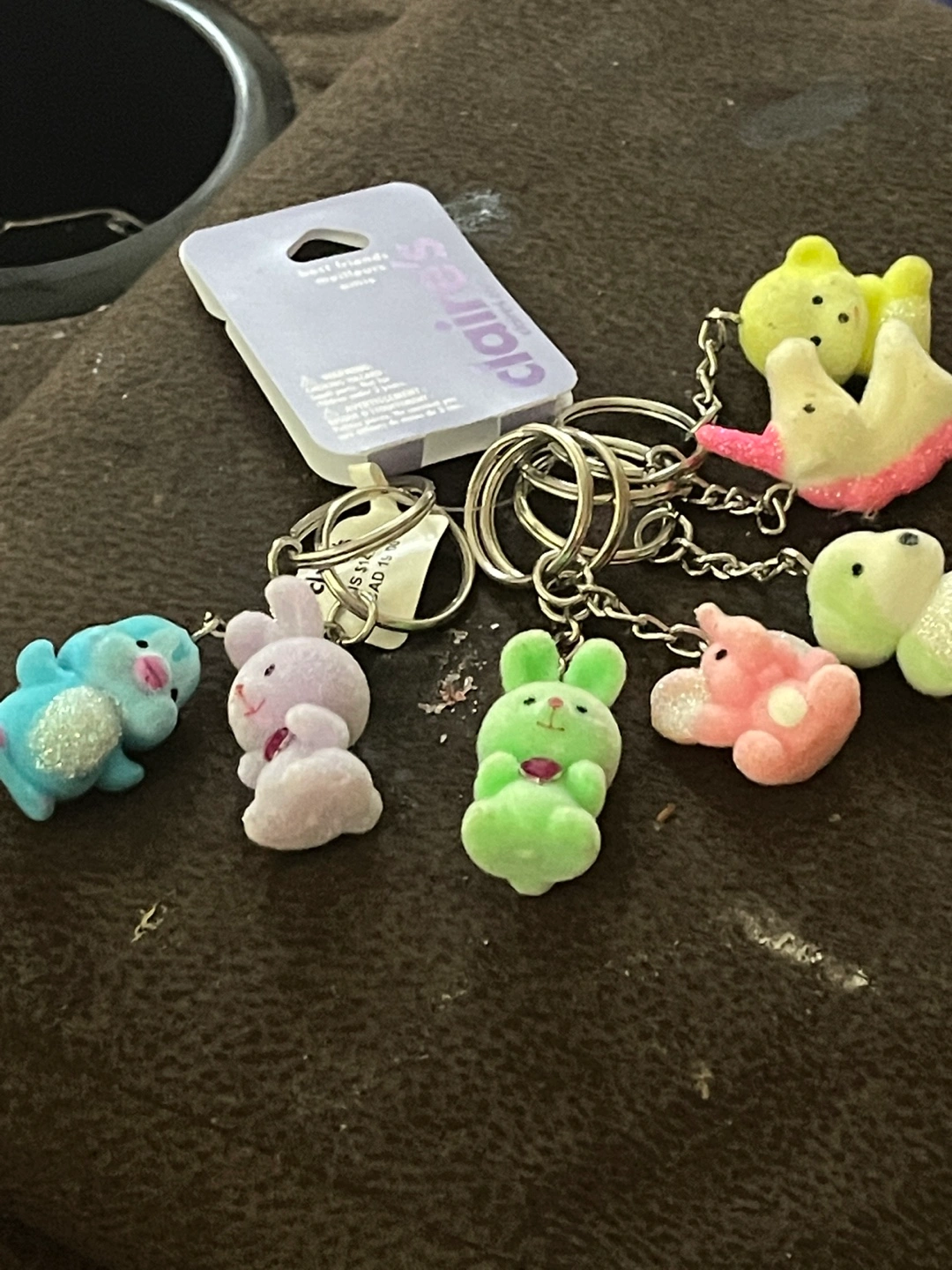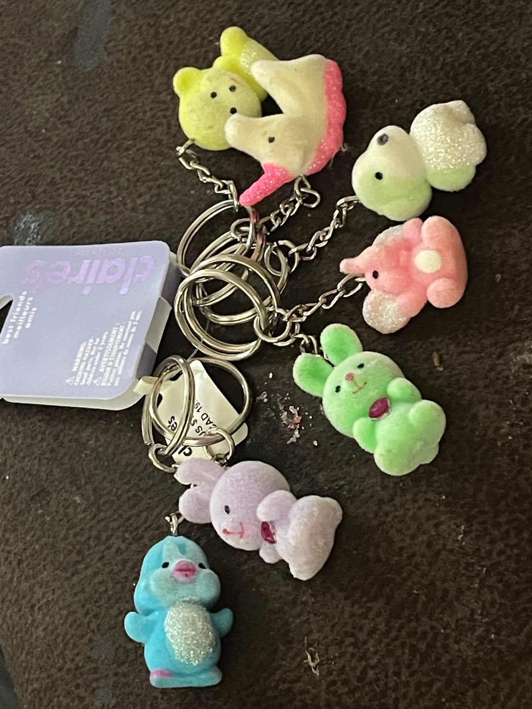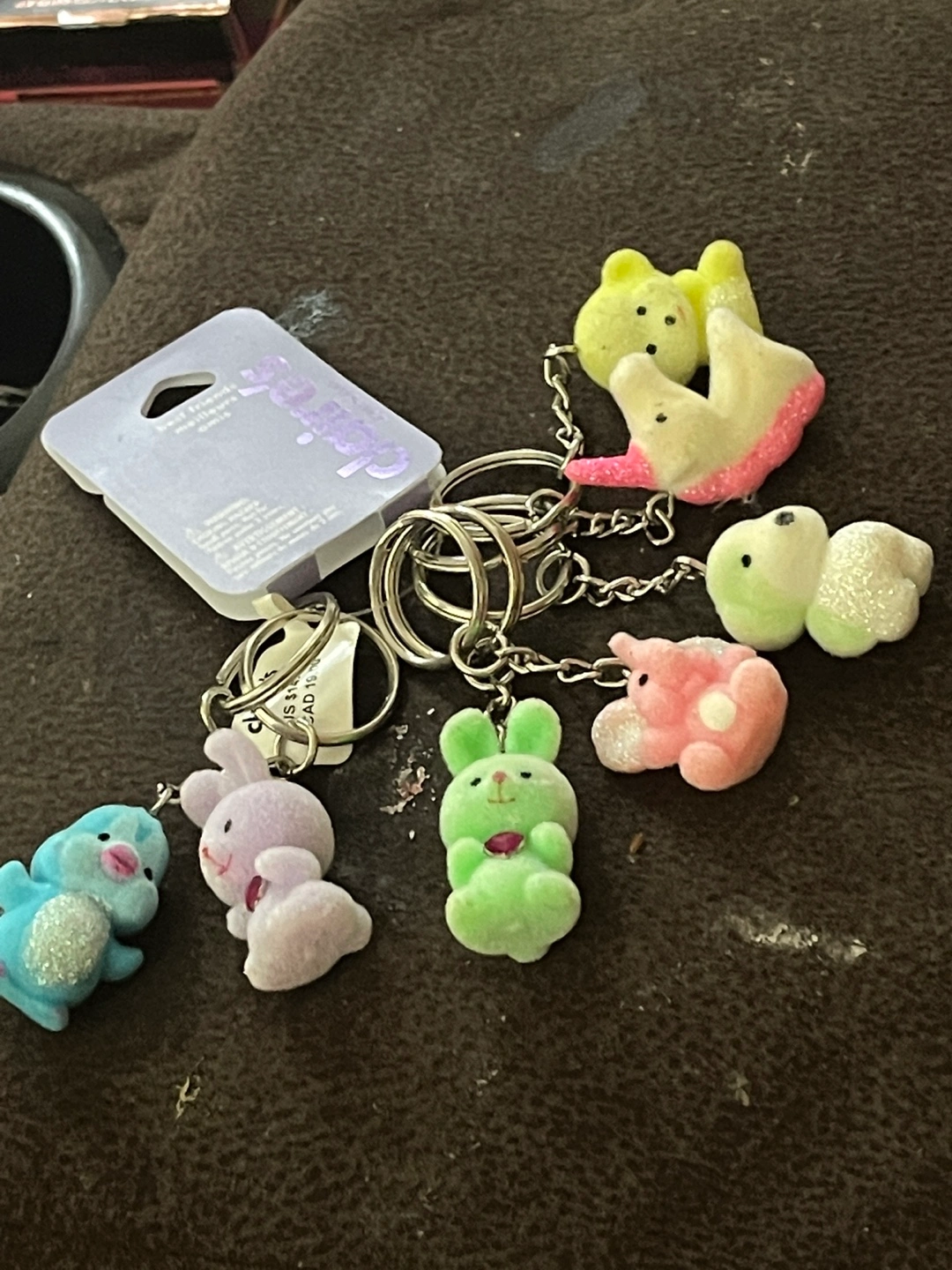 103Seven pastel-colored animal keychains. Includes bunnies, a unicorn, and bears. Glitter accents. New with tags. Available for local pickup by Schaumburg and Barrington Road in Schaumburg IL 60194 or shipping to your doorstep for one low price with tracking included for free. Comes from a virus free, smoke free and pet free home.