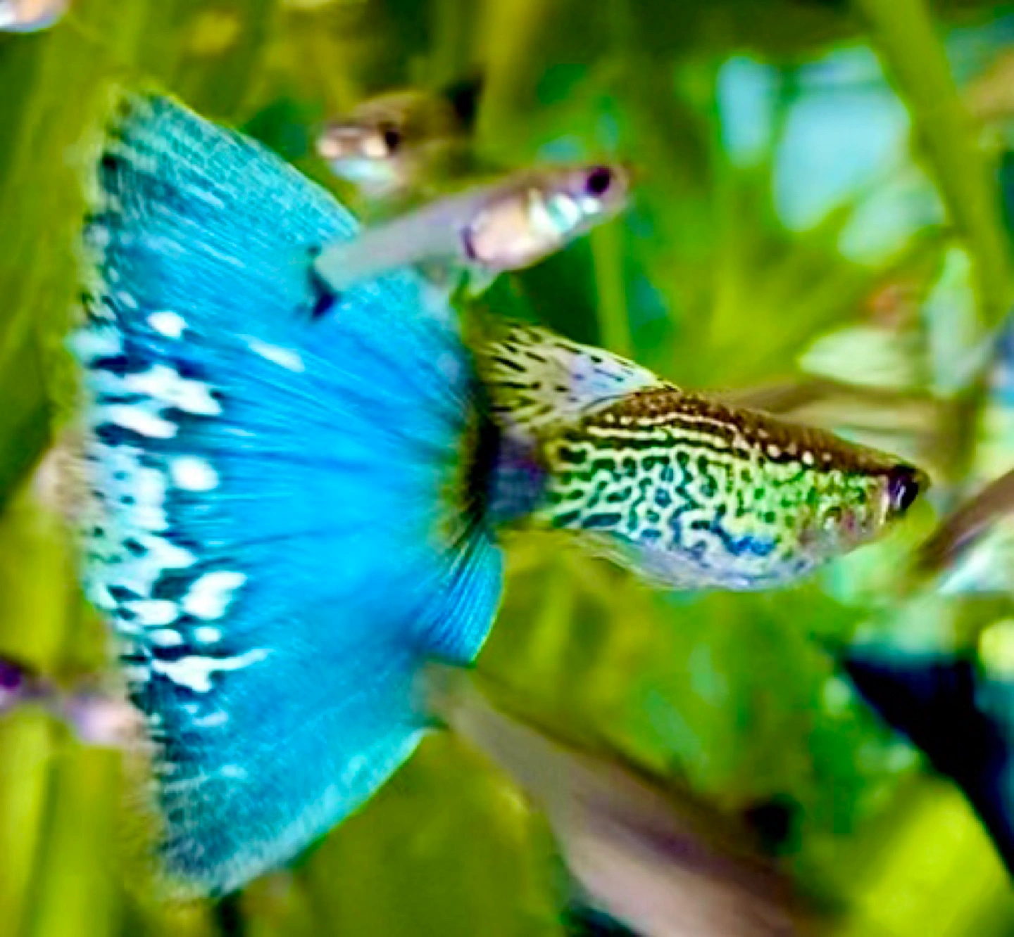 15Vibrant blue guppy, large tail fins. Perfect for any aquarium. Healthy and active.