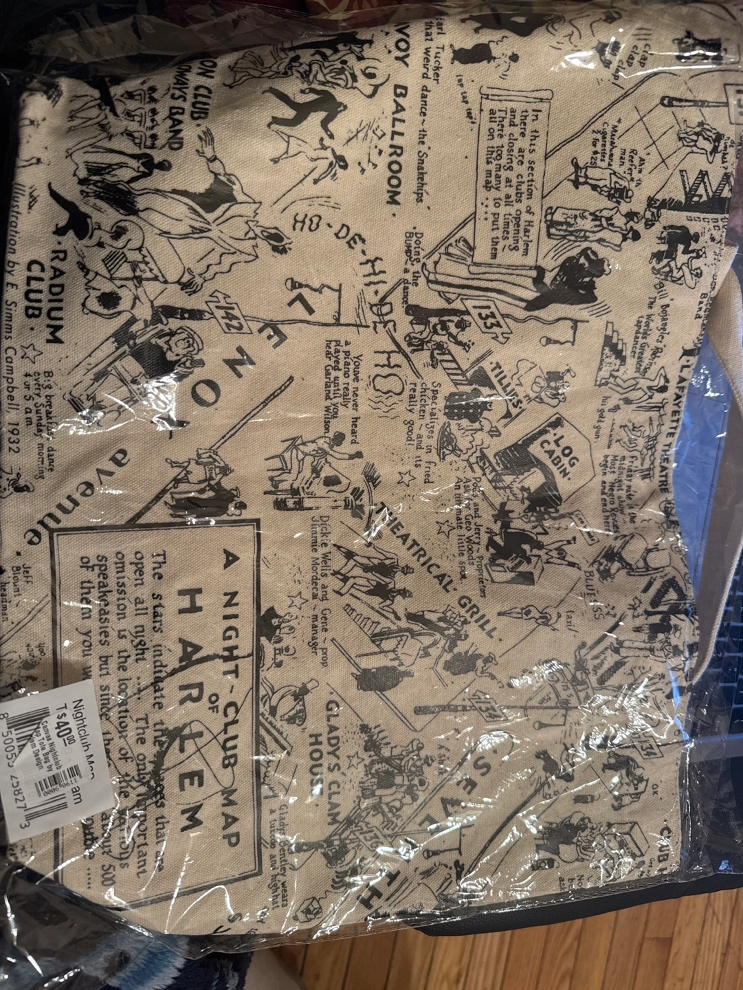 Canvas tote bag. Features a vintage-style illustration of a Harlem nightlife map. Black and white design on a beige canvas.