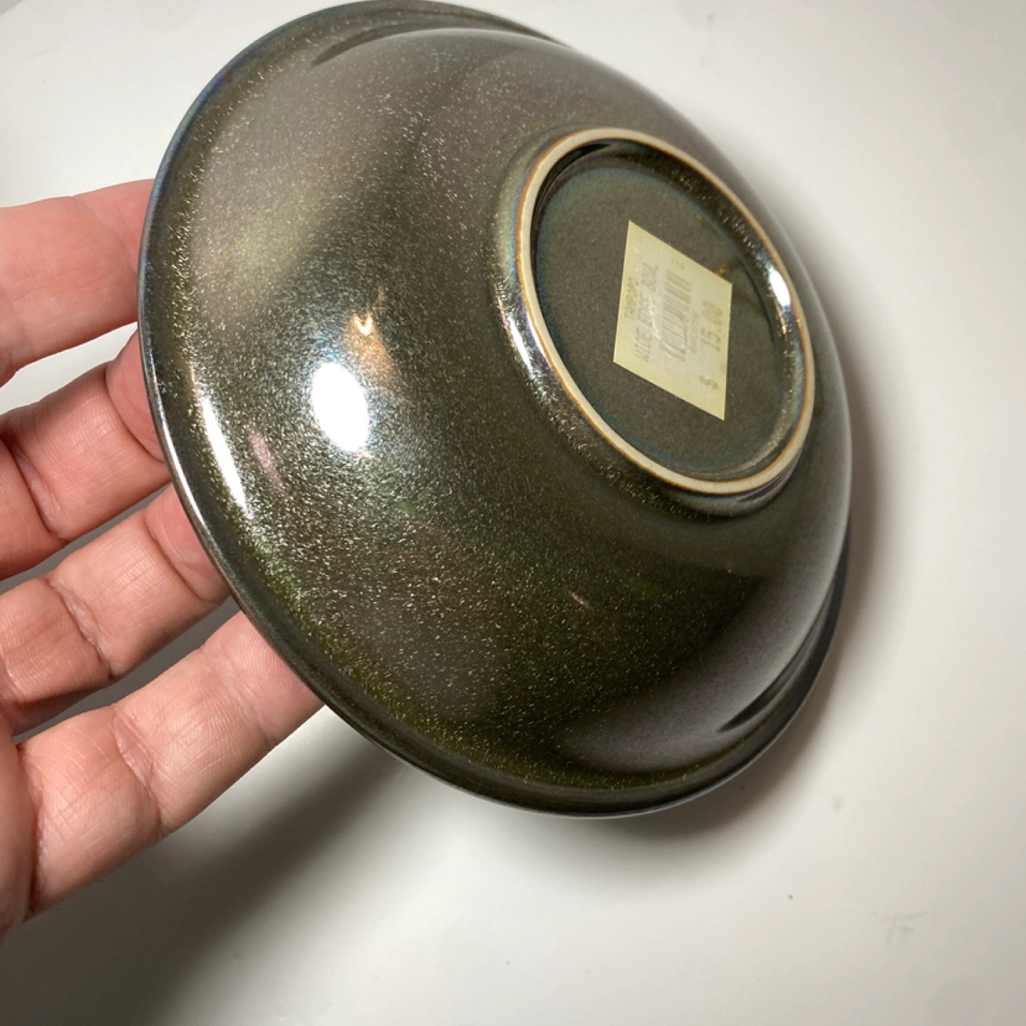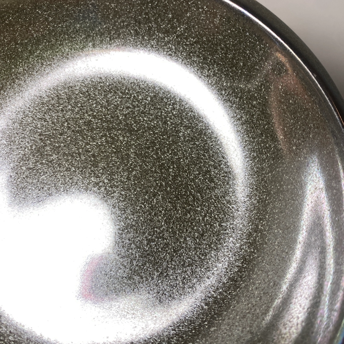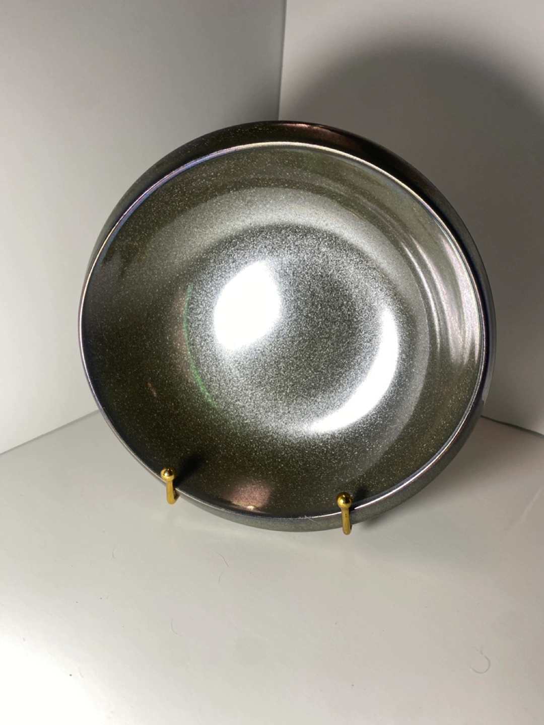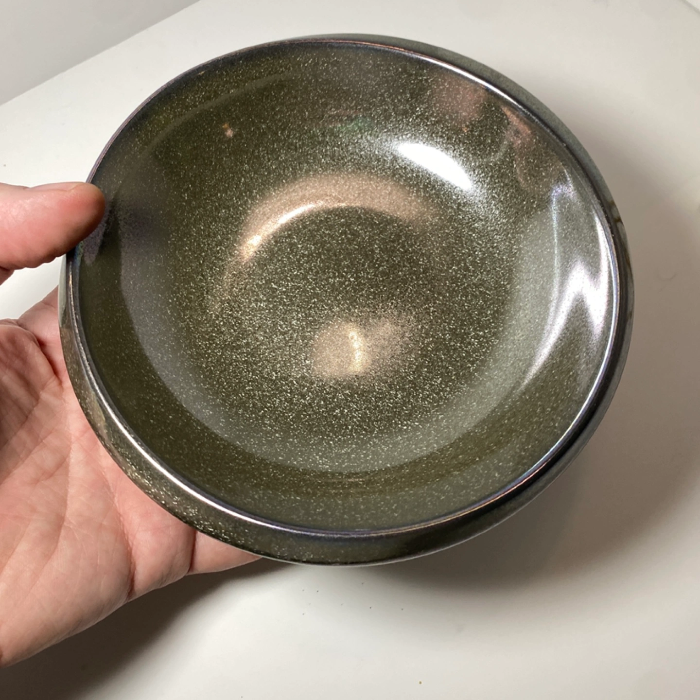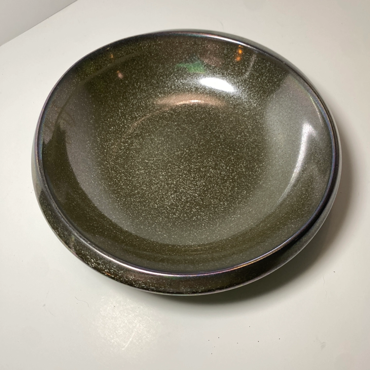 328Small, shallow bowl. Dark greenish grey speckled glaze. Unique design. Perfect for snacks or small servings…or as a catch all for coins, keys, etc. Pickup on Astoria Blvd South