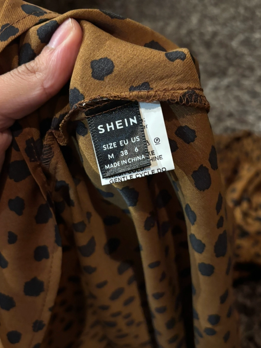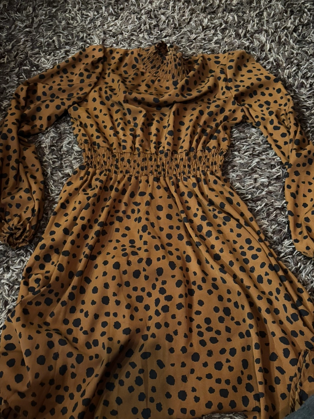 60Cute brown and black dalmatian print midi dress. Long sleeves, mock neck, and fitted waist. Size Medium.