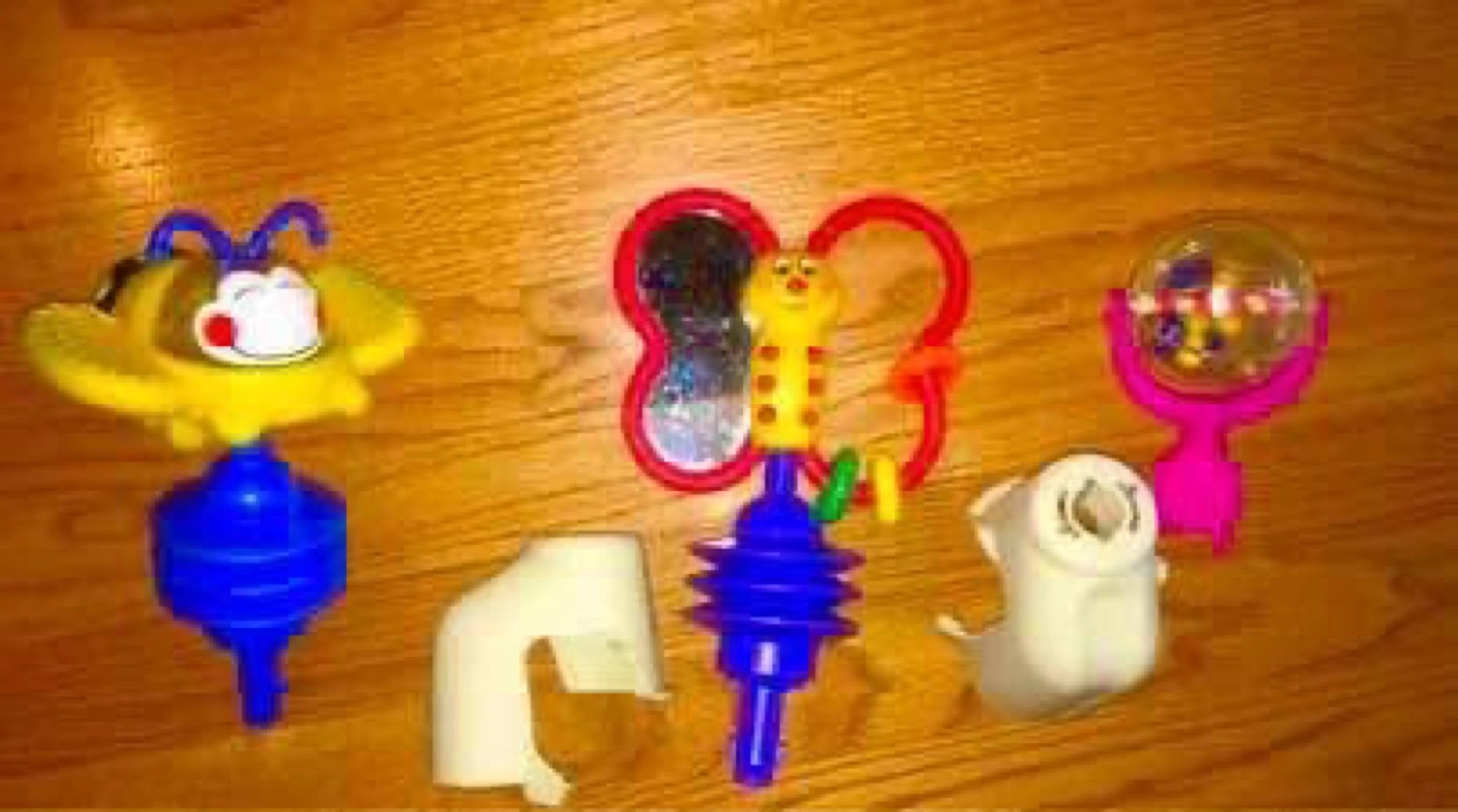 Spins with little balls inside . all pieces come apart for easy washing. These toys retail for $15 each