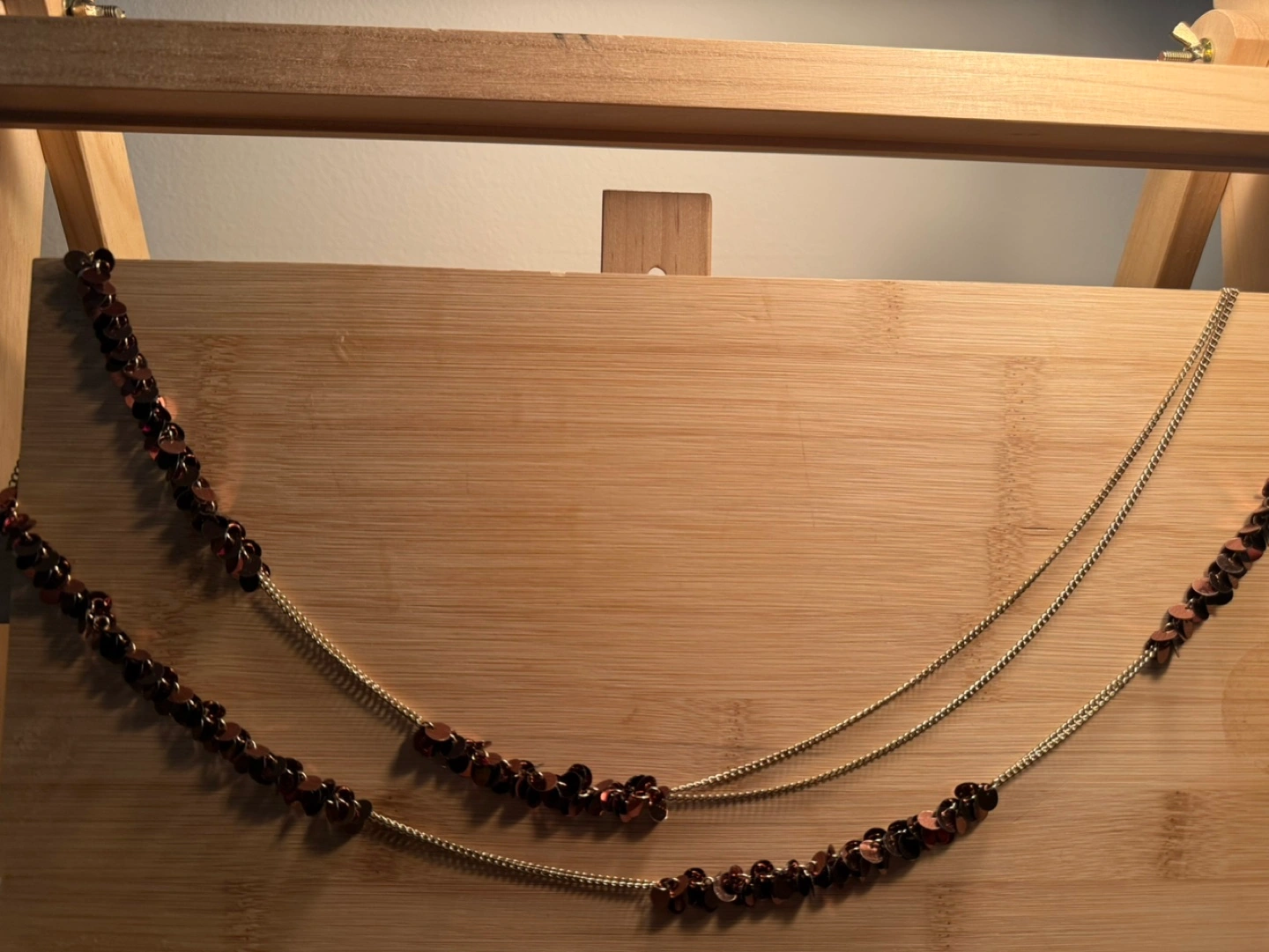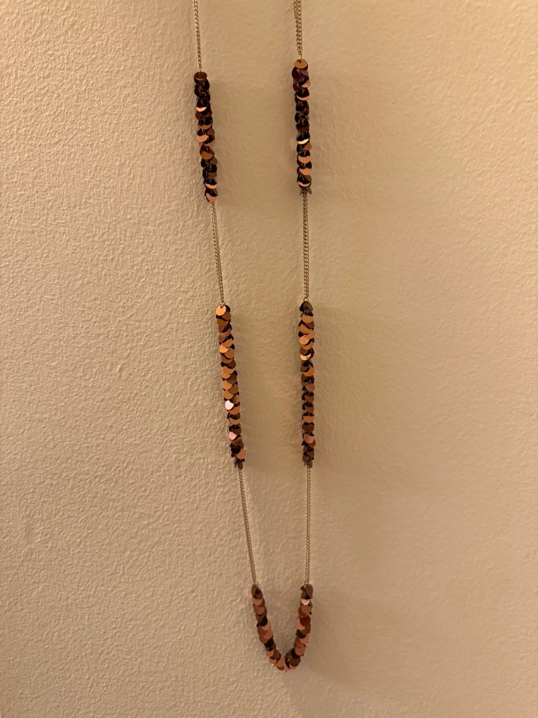 272Long layered necklace. Features copper-colored sequined beads and thin gold chains. Perfect for layering or wearing alone.