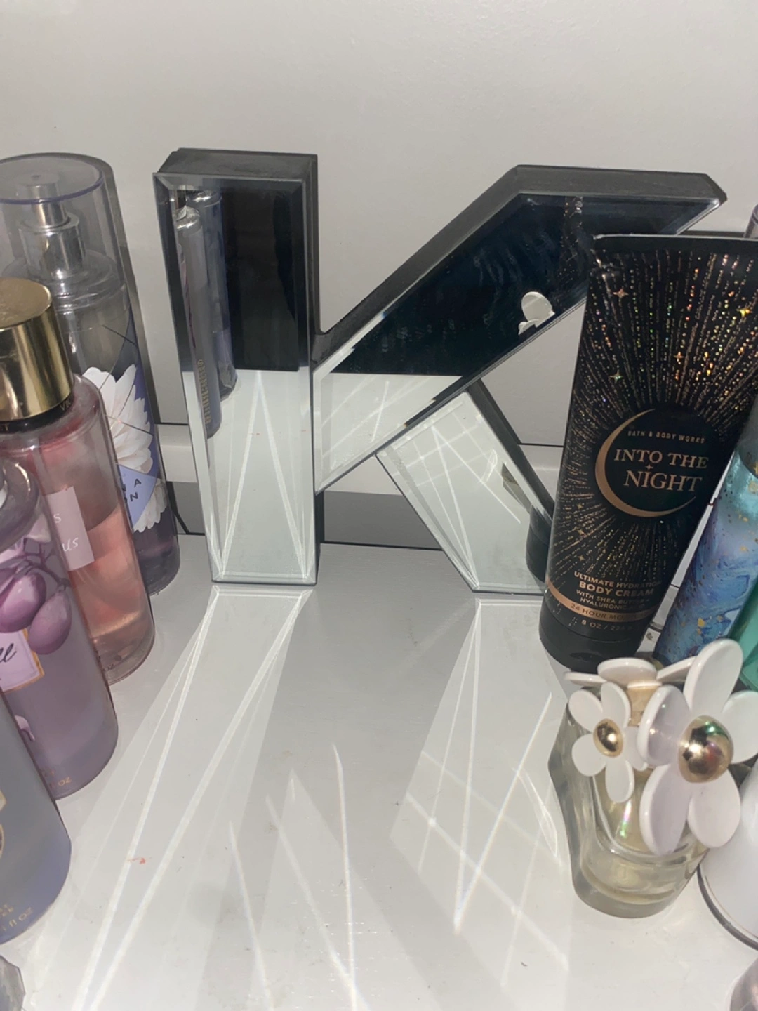 Large mirrored letter K. Perfect for shelf decor or vanity. Adds a touch of glam.