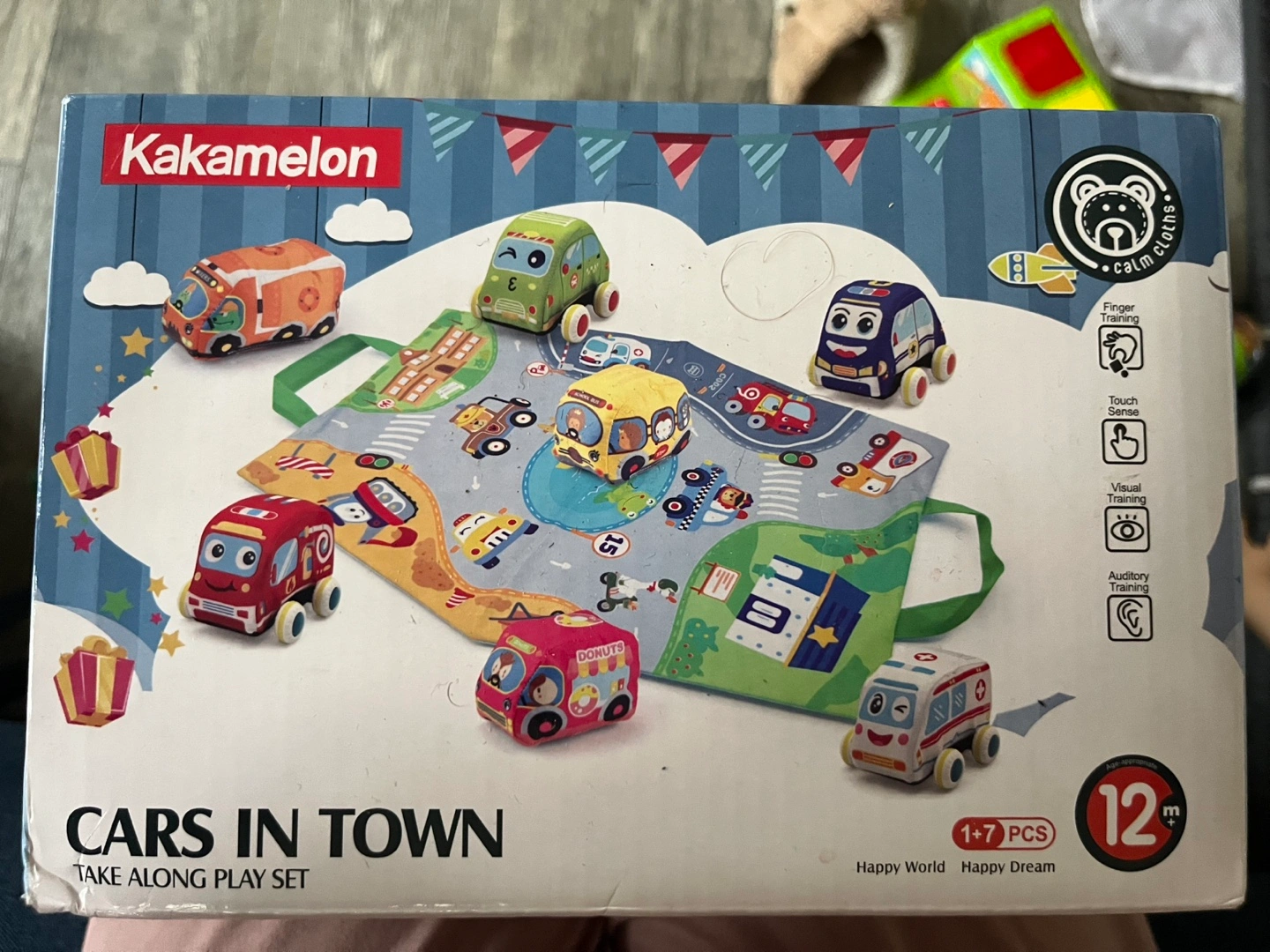 Brand new New Kakamelón Cars in Town take along play set. Seven piece soft car toy set for babies. Includes play mat and 7 soft toy cars. Suitable for ages 12 months and up. Great gift for babies.