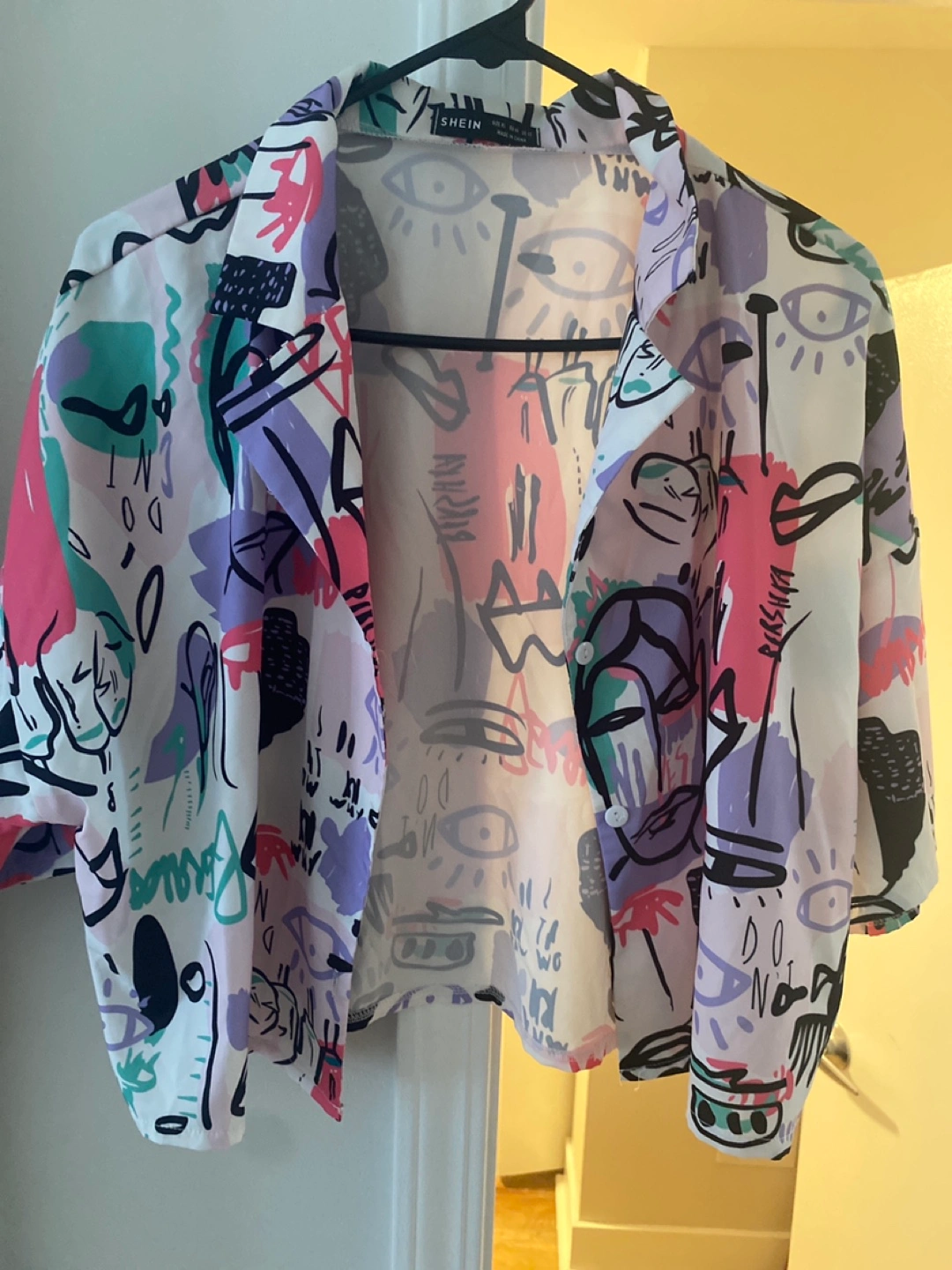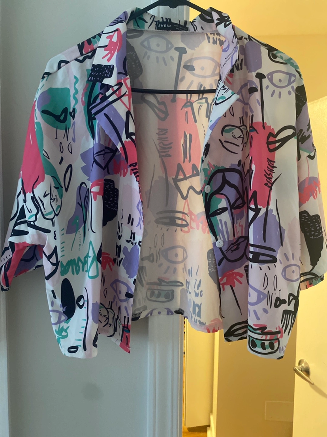 Colorful abstract print. Short sleeves. Cropped length. Button closure. Casual style. Perfect for spring or summer.